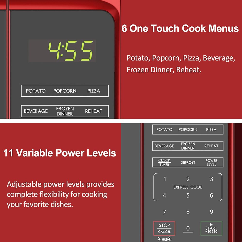 6 قوائم معدة مسبقًا وطهي سريع: سهل الطبخ مع 6 برامج طهي بلمسة واحدة: البطاطس والفشار والبيتزا والمشروبات والعشاء المجمد وإعادة التسخين. أيضًا، يمكنك البدء في الطهي بسرعة لمدة 1-6 دقائق بالضغط على لوحة الأرقام المقابلة.
