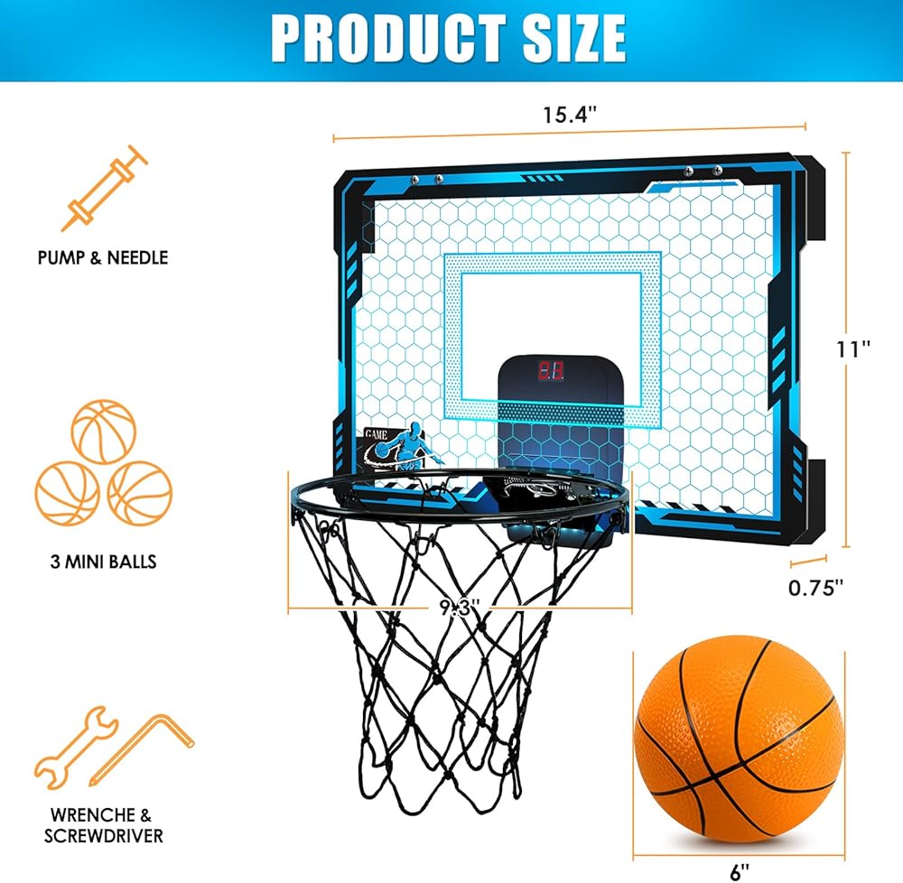 طوق كرة سلة داخلي صغير للباب مزود بـ 7 أضواء ملونة | حلقة كرة السلة فوق الباب مع لوحة النتائج والبطاريات| حلقة كرة السلة للغرفة للبنين البنات 5 6 7 8 9 10 11 12