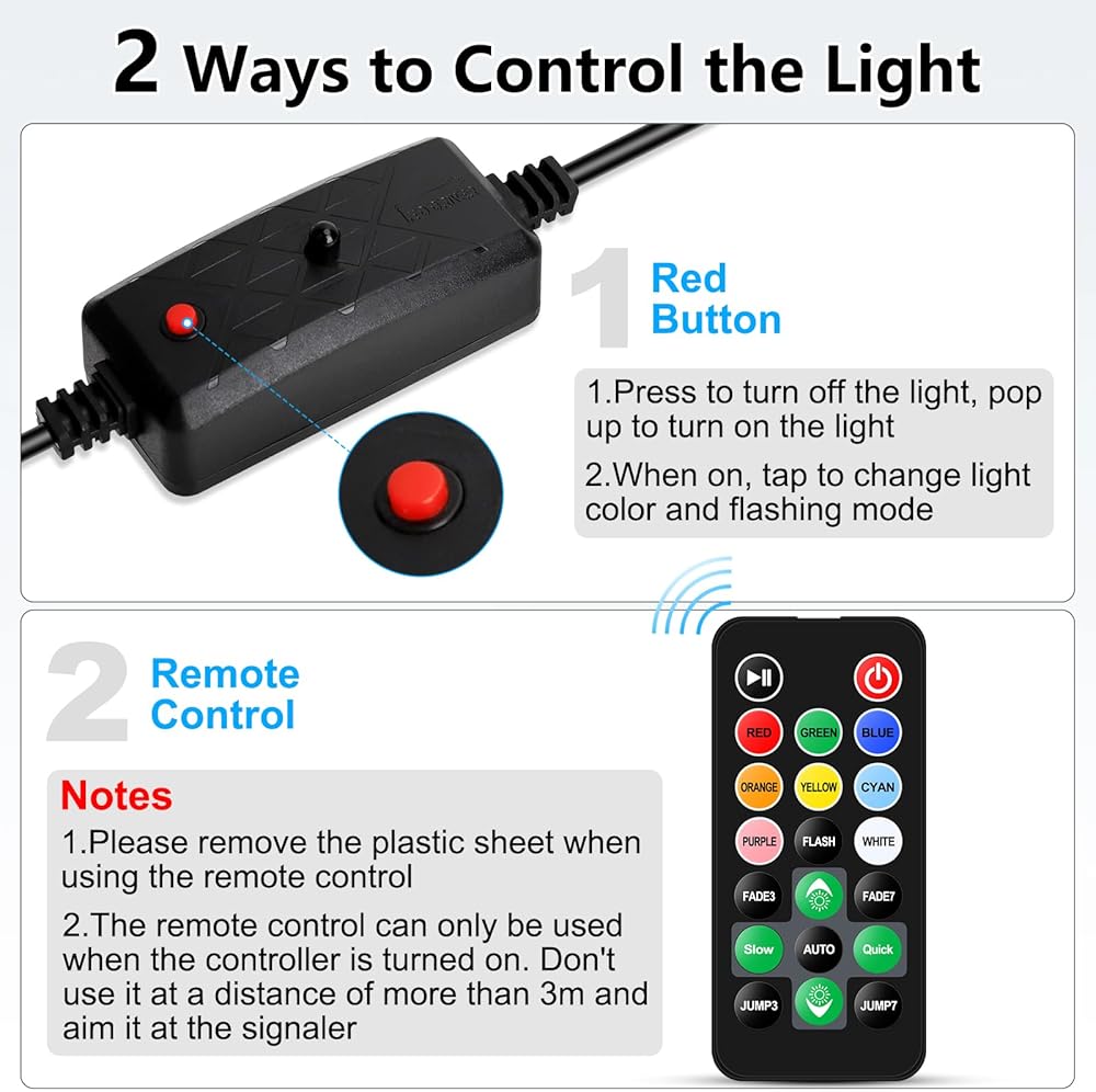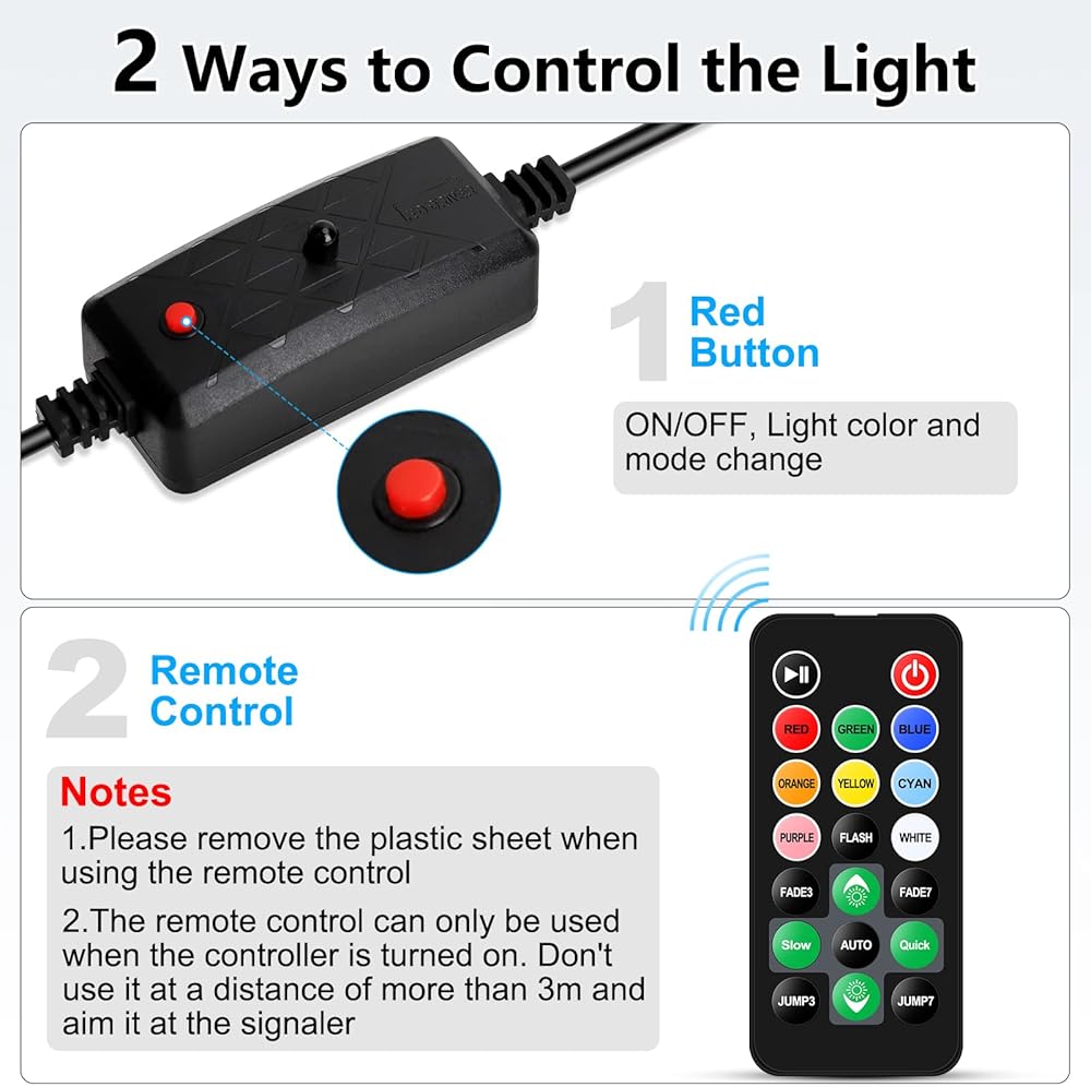 【نوعان من التحكم عن بعد】 يحتوي ضوء حوض السمك على طريقتين للتحكم، واحدة من خلال الإشارة الموجودة على الزر الأحمر الذي يعمل باللمس لتغيير لون الضوء ووضعه، والثانية في حالة تشغيل الإشارة، من خلال جهاز التحكم عن بعد إلى التحكم في لون الضوء ووضعه وتغيير السطوع (استخدم جهاز التحكم عن بعد، يرجى سحب الورقة البلاستيكية والتأكد من الضغط على الإشارة الموجودة على الزر الأحمر).