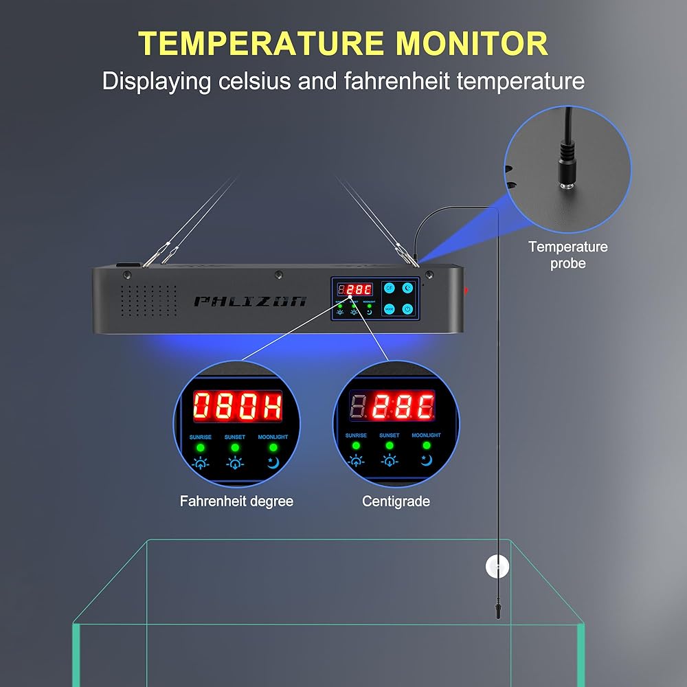 مراقب درجة الحرارة - ضع مسبار درجة حرارة الماء (المتضمن في العبوة) في حوض السمك ويمكنك رؤية درجة حرارة الخزان على الشاشة. ابق على اطلاع بدرجة حرارة الماء للحفاظ على الظروف المثالية لصحة وحيوية أسماكك وحياة النباتات