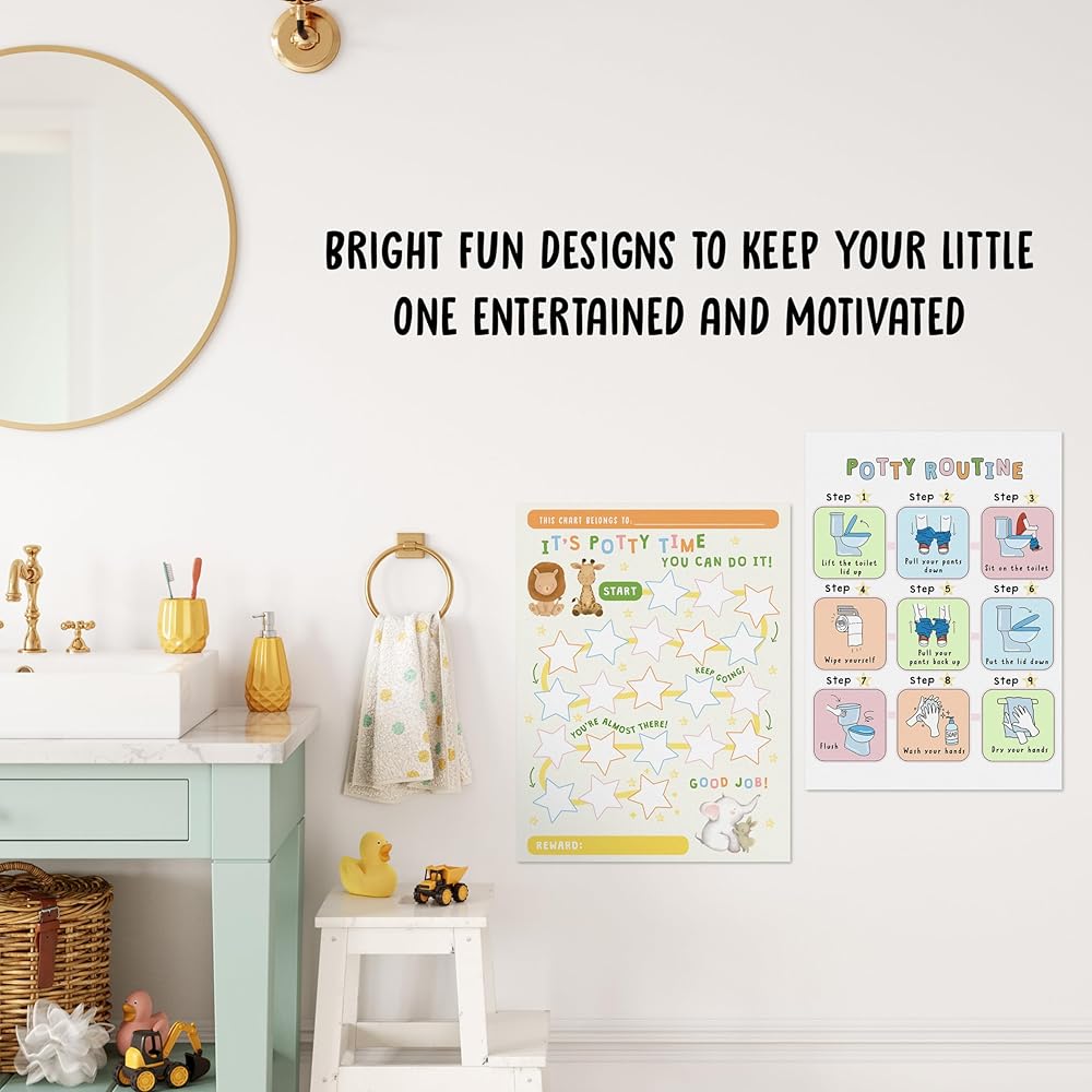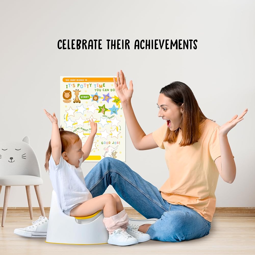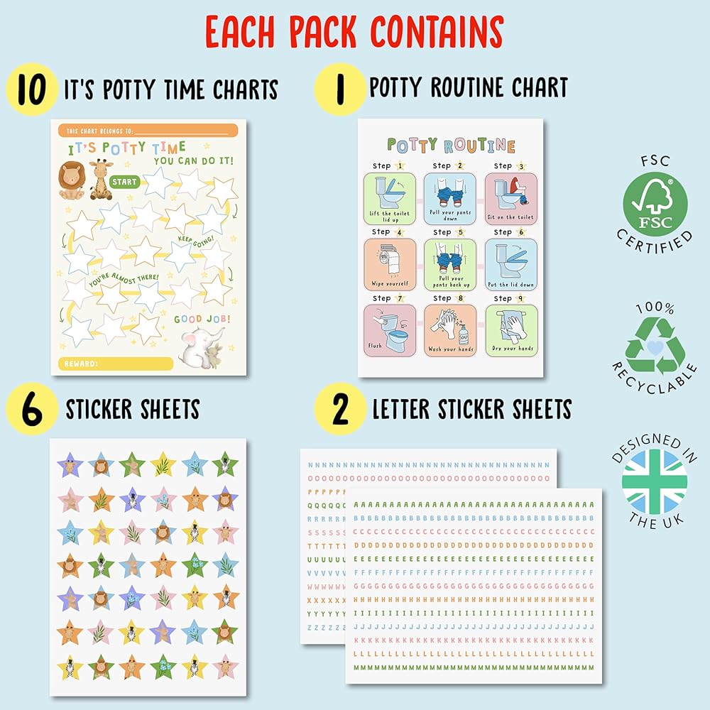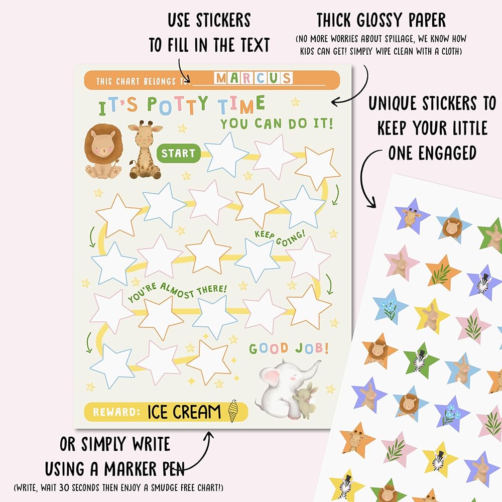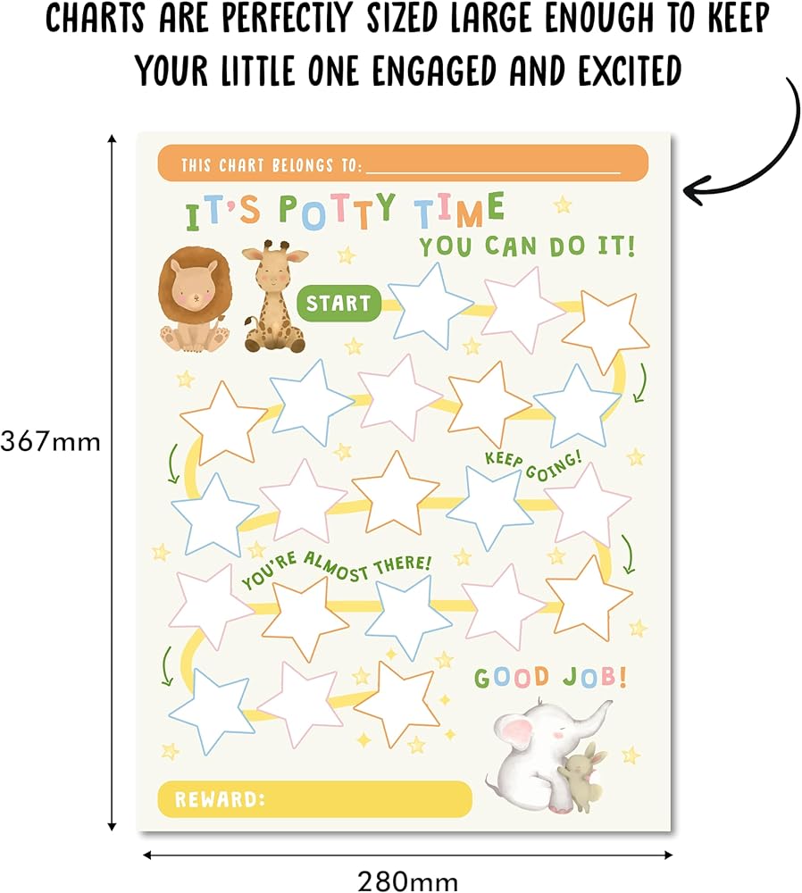 الملصقات التفاعلية: يأتي كل مخطط مع مجموعة متنوعة من الملصقات الملونة والممتعة. عندما يستخدم طفلك القصرية بنجاح، يمكنه بكل فخر وضع ملصق على الرسم البياني الخاص به. يوفر هذا العنصر التفاعلي التعزيز الإيجابي والشعور بالإنجاز.