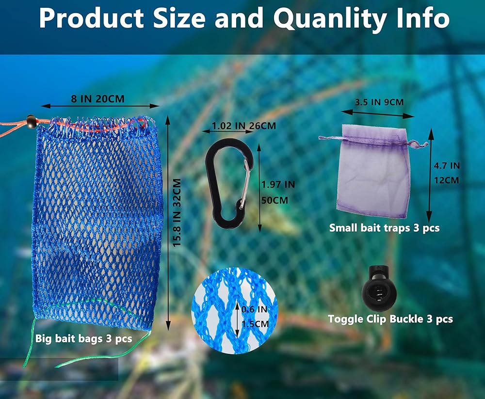 آمنة وفعالة: يبلغ مقاس حلقة التثبيت المتضمنة حوالي 1.97 × 1.02 بوصة وتسمح بسهولة التركيب، مما يضمن بقاء الطعم الخاص بك آمنًا في الحقيبة. تصميمه العملي يمنع الأسماك أو سرطان البحر من الوصول إلى الطعم من خارج المصيدة، مما يعزز معدل الصيد الخاص بك مع المزيد من الراحة.