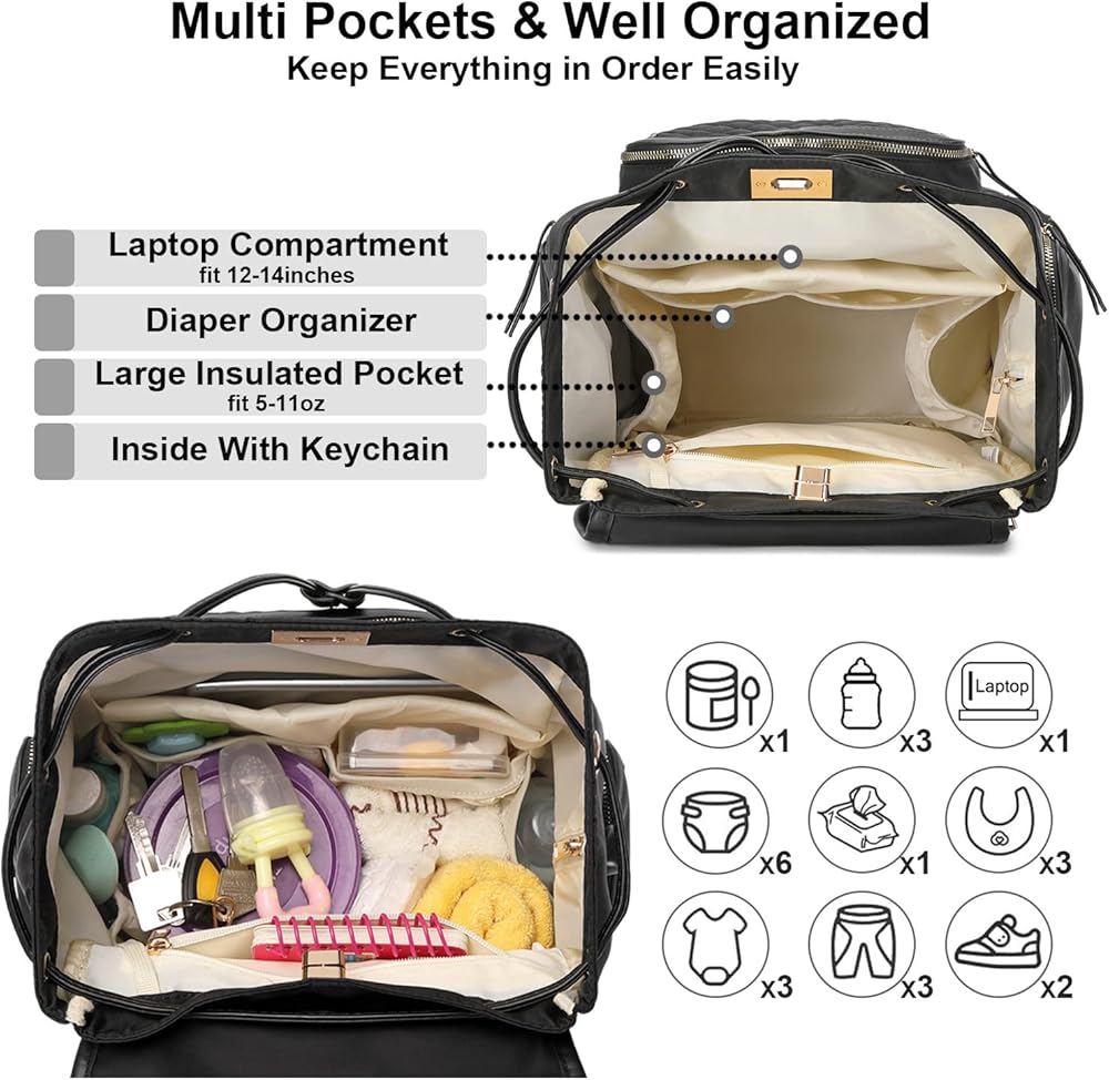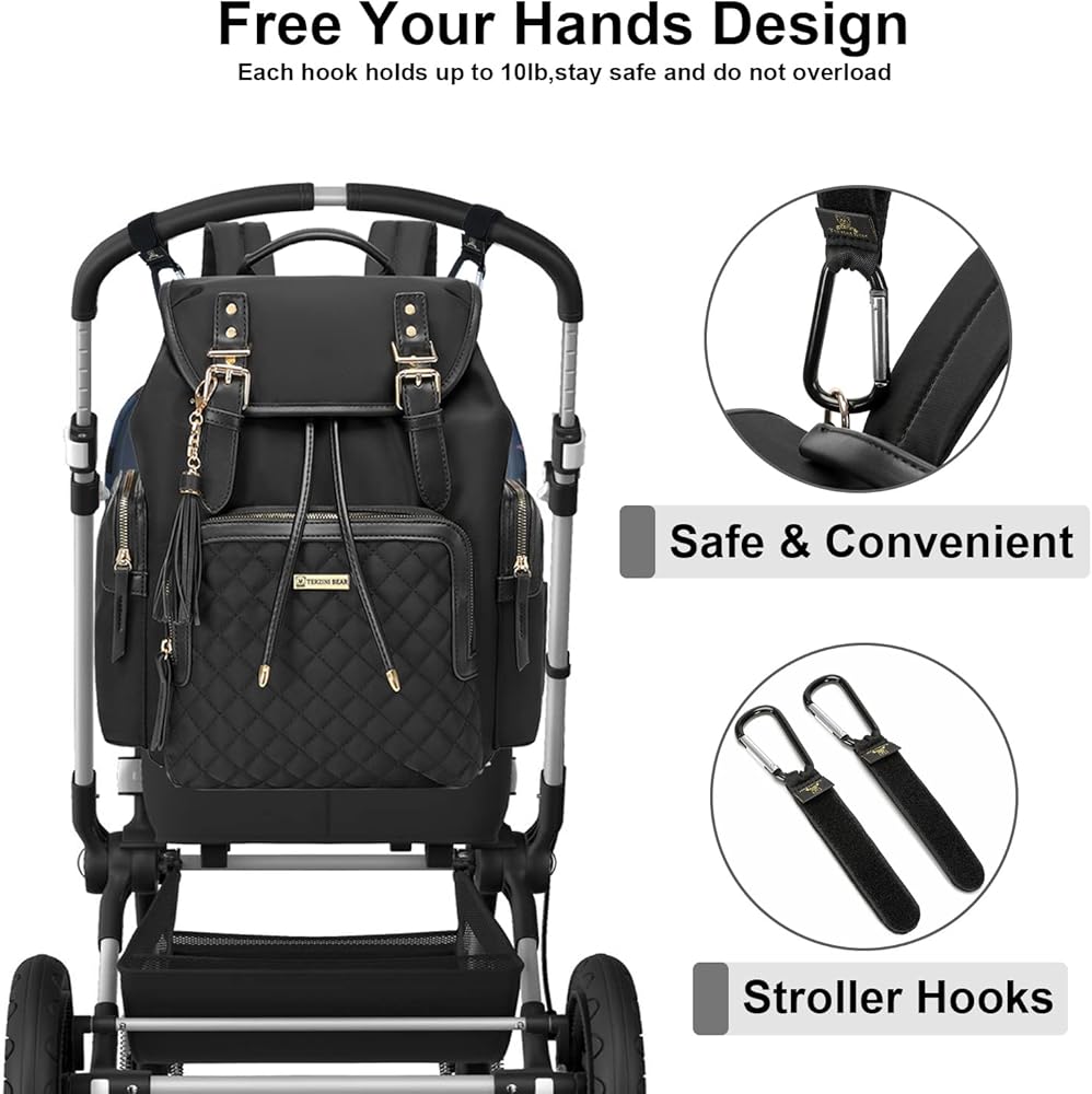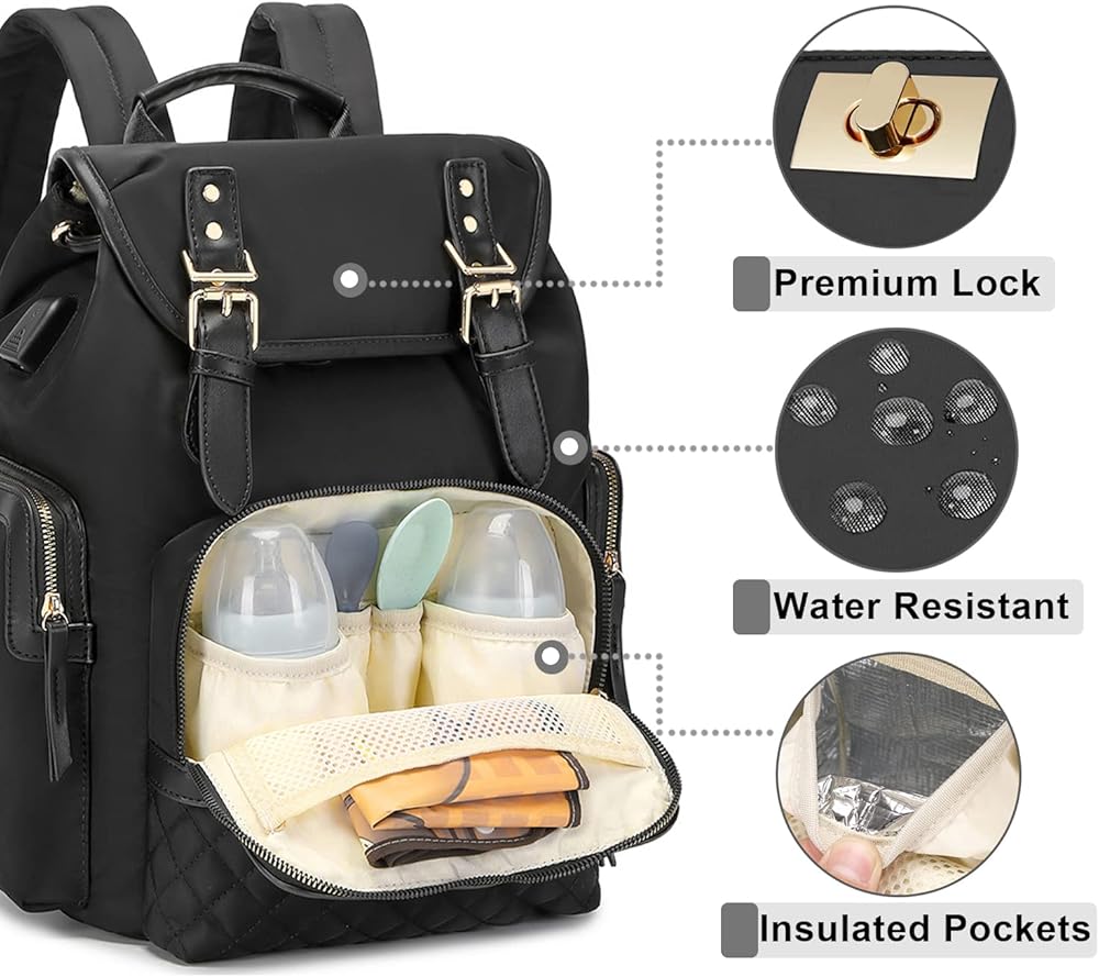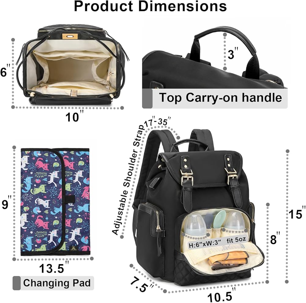 حقيبة ظهر للحفاضات، حقائب حفاضات للأطفال الأولاد والبنات مع منفذ شحن USB، سجادة تغيير الحفاضات، خطافات عربة الأطفال (أسود)