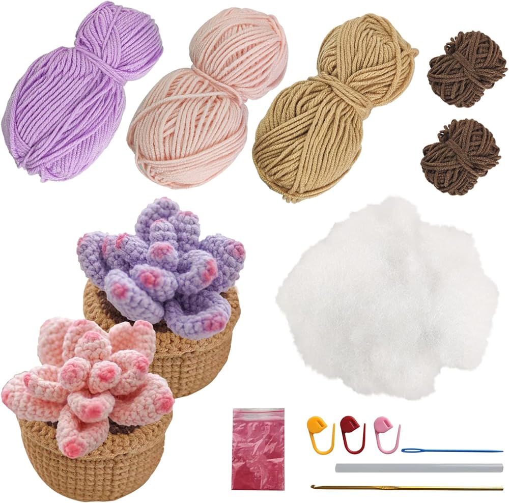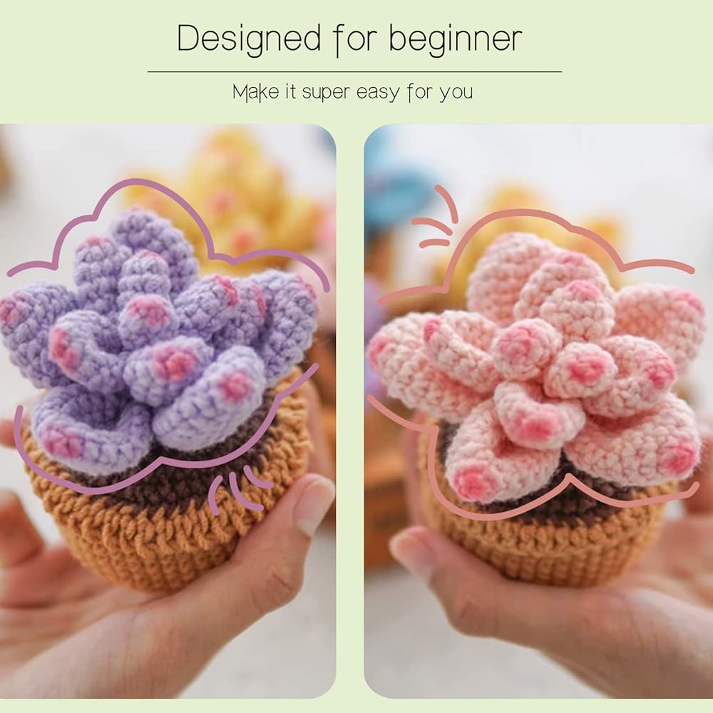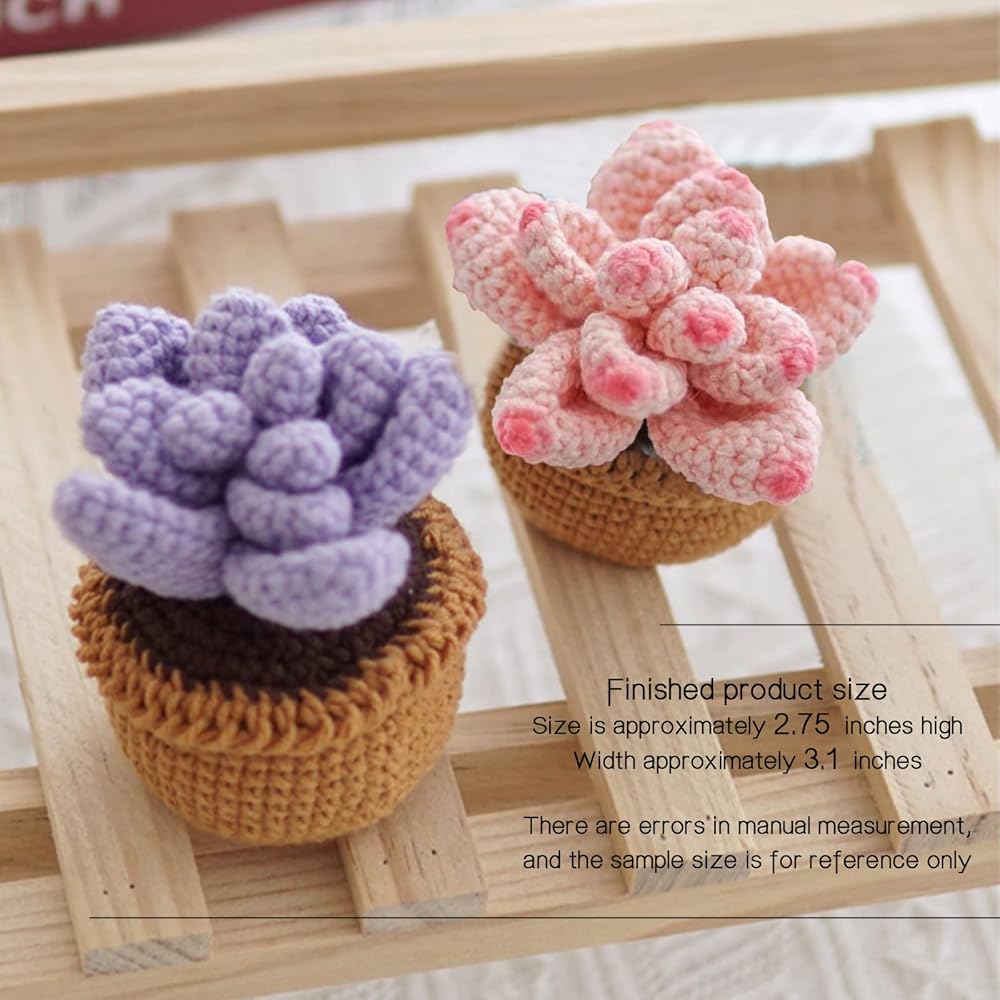 Complete beginner crochet kit:You will receive a complete material package,which contains complete crochet accessories,knitting tool set,filling cotton,glue stick,knitting instructions and step-by-step video to make 2 coclor different cute potted plants