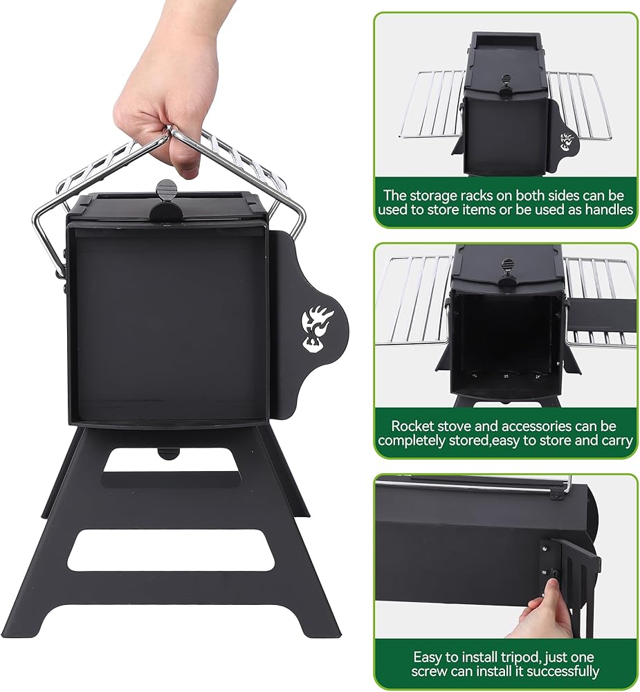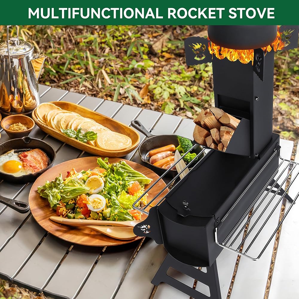 تصميم مبتكر لموقد الصواريخ: يتميز موقد الصواريخ الخاص بنا بتصميم رف فريد مزدوج الجوانب يعمل بمثابة تخزين لمكونات الطبخ وكمقابض. لمزيد من الراحة أثناء السفر، نقدم حقيبة تخزين لسهولة الحمل.