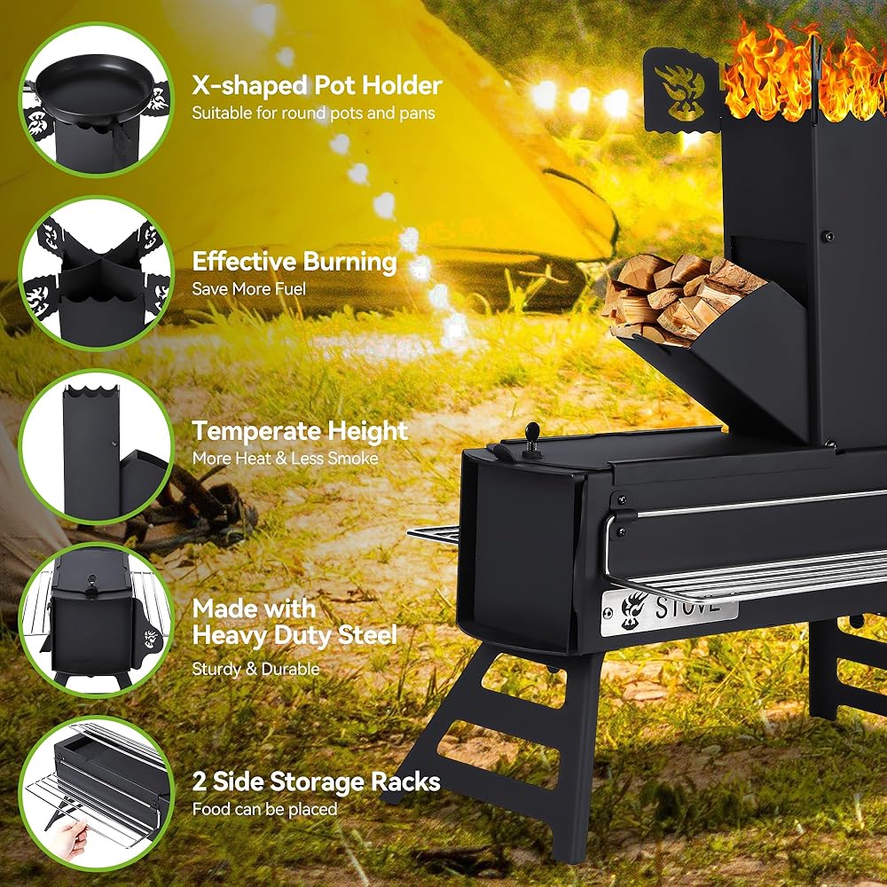 مصنوع بامتياز: تم تصميم موقد الصواريخ الخاص بنا بخبرة من الفولاذ الكربوني عالي الجودة، مما يضمن المتانة وطول العمر مع توفير حرارة وافرة أثناء الاستخدام.