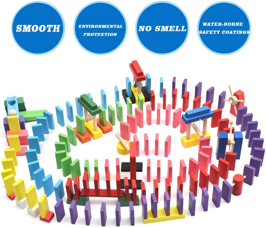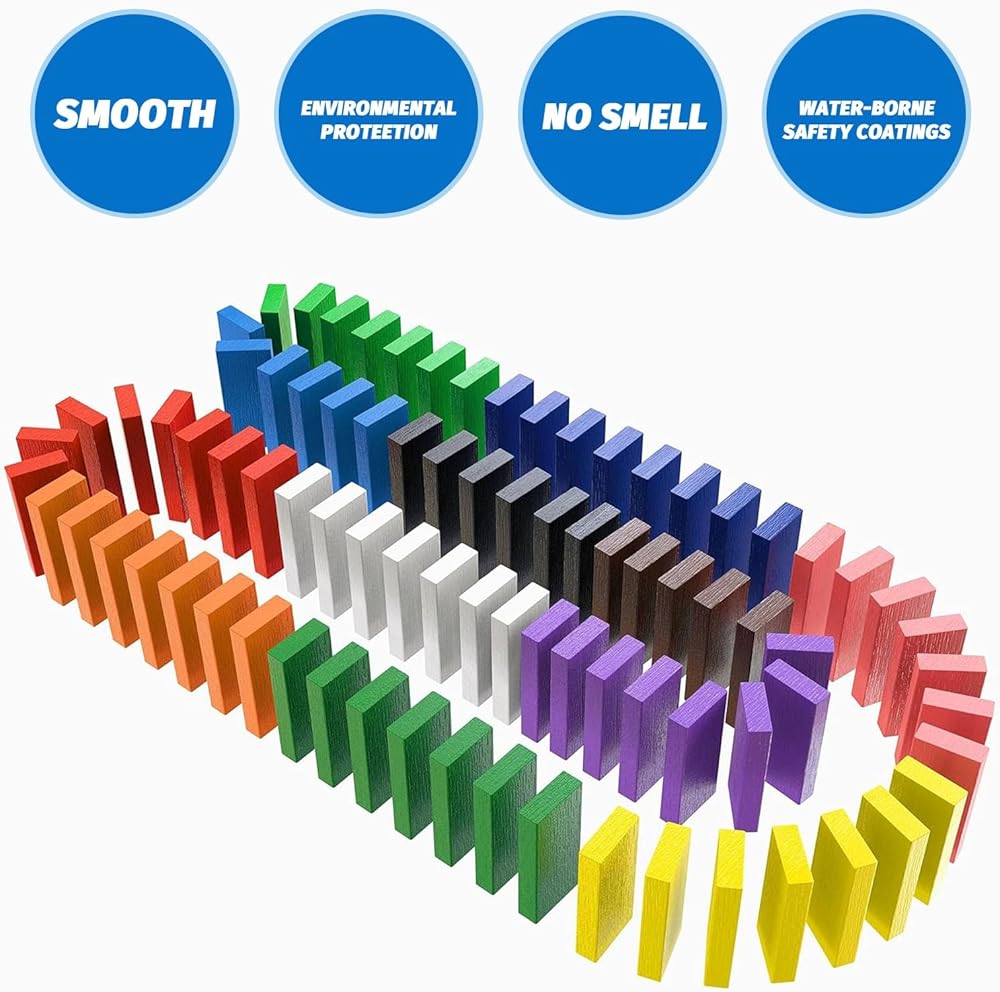 Safe Material - Using high-quality wood which is non-toxic, tasteless and the paint is water-based & food-grade. The Dominoes Set is harmless to human health and suitable for children toys. Each edge of blocks has circular arc design, smooth polished without burrs, making the blocks smooth to touch.