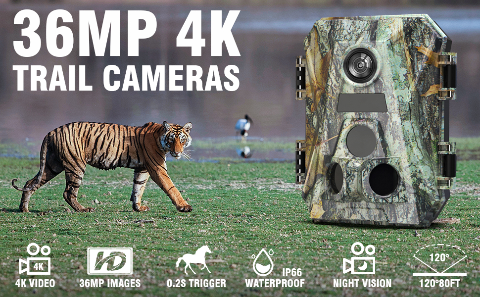 كاميرات LEEDEER Game Hunting Cameras 36MP 4K Trail مع رؤية ليلية، مشغل 0.2 ثانية، زاوية واسعة، نطاق 80 قدمًا، IP66، شاشة LCD 2 بوصة، بطاقة TF سعة 32 جيجابايت - لمراقبة الحياة البرية في الهواء الطلق وأمن المنزل