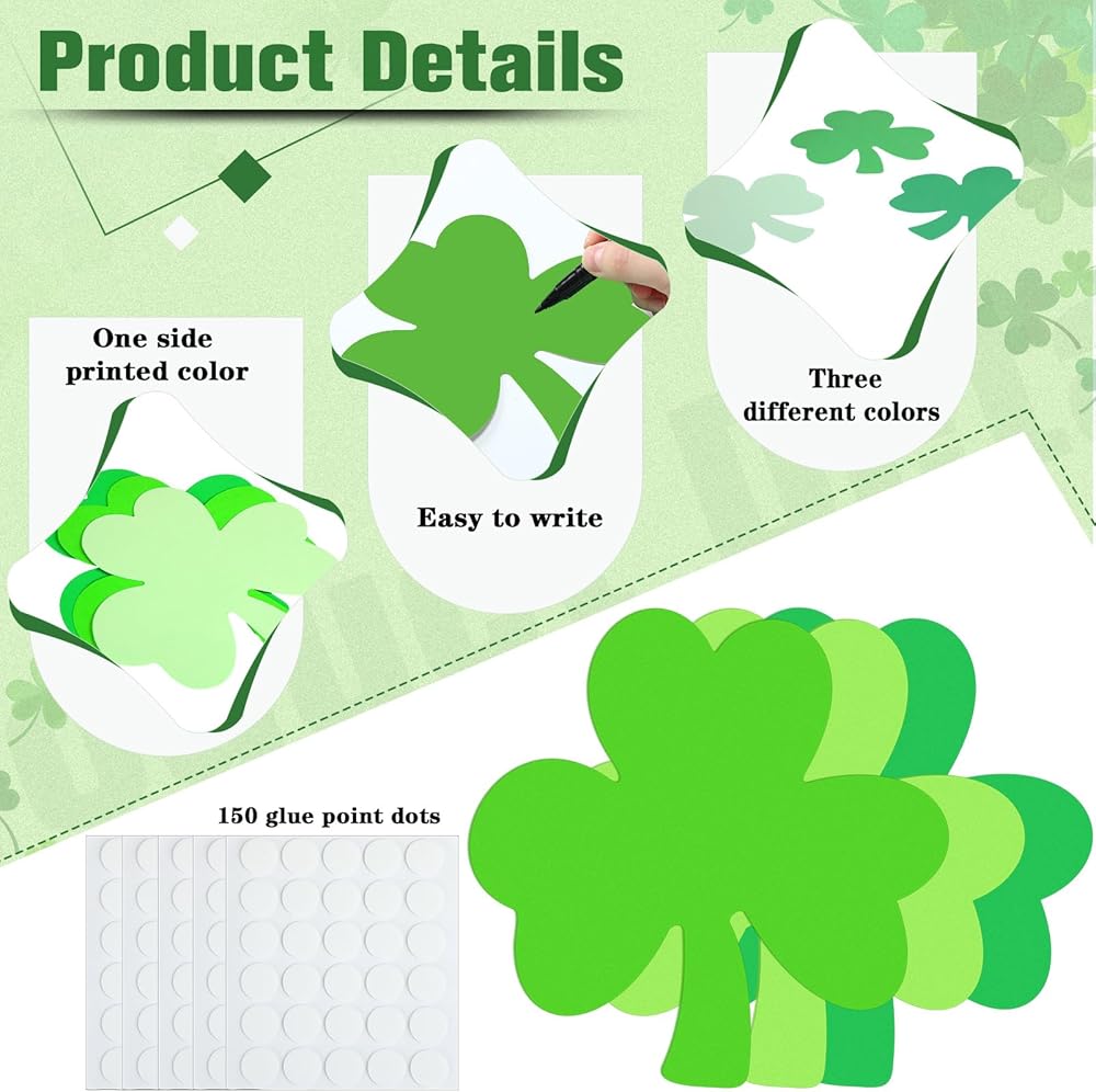 مواد عالية الجودة وحجم مثالي: عزز احتفالات عيد القديس باتريك الخاصة بك مع قطع زينة نبات النفل المصنوعة من مادة الورق السميك؛ الملمس الناعم لهذه القصاصات يجعلها مثالية للكتابة أو الرسم؛ يبلغ مقاسها حوالي 5.5 سم، وهي الحجم المناسب لديكورات DIY، مع توفير مساحة كافية لإنشاء رسائل أو تصميمات مخصصة