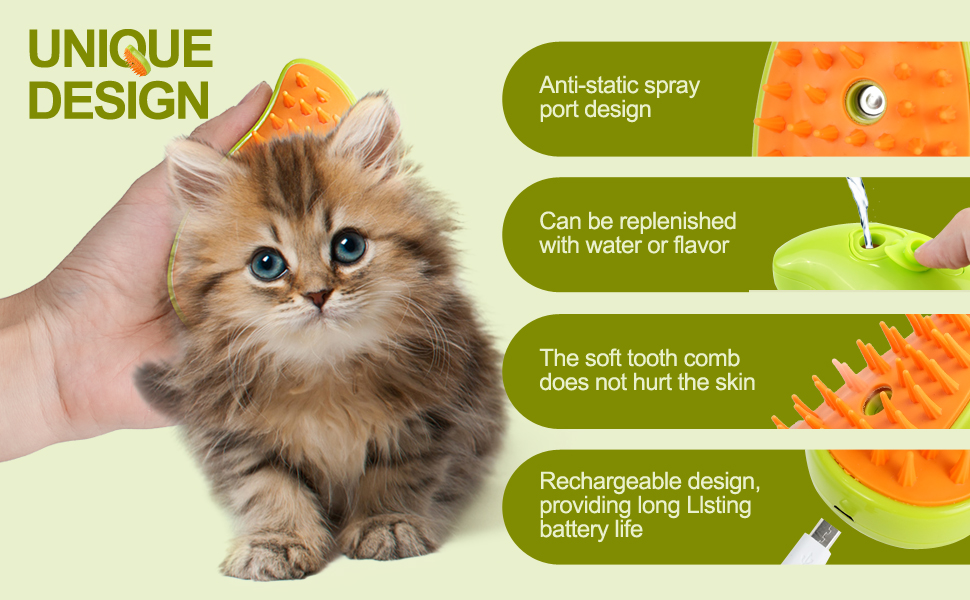 【تصميم رذاذ الماء】: فرشاة للقطط مشبع بالبخار بتصميم رذاذ فريد، يمكن إعادة ملؤها بالماء أو الجوهر. يمكن للرذاذ أن يجعل شعر الحيوان الأليف رطبًا قليلاً لتخفيف وإزالة الغبار والأوساخ المتراكمة من شعر القطط بشكل فعال. يمكن للرذاذ بنقرة واحدة أيضًا تجنب توليد الكهرباء الساكنة وتجنب الشعر المتطاير عند تنظيف القطة.