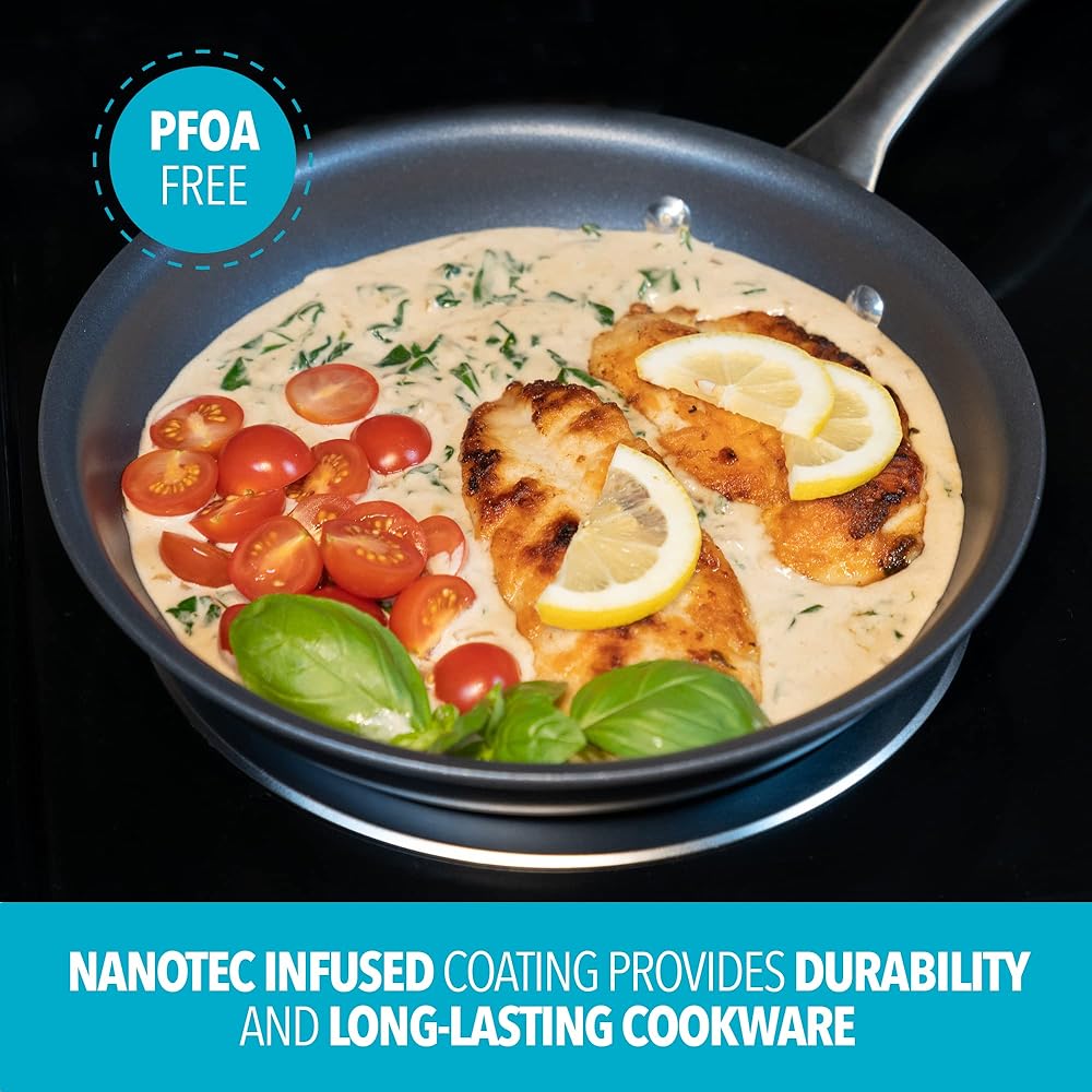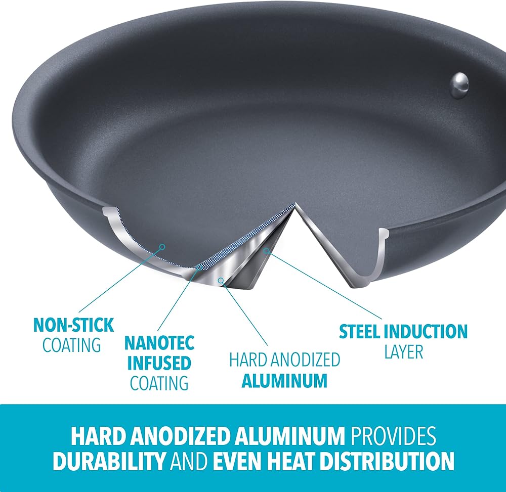 • سطح غير لاصق مملوء بالنانوتيك: يوفر إطلاقًا ممتازًا وهو آمن للأواني المعدنية حتى تتمكن من طهي وتقديم الوجبات في وعاء واحد.
