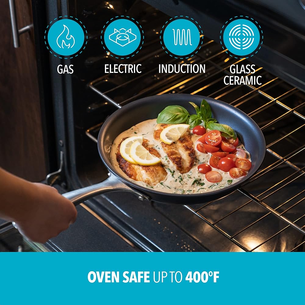 • قابلة للحث وآمنة في الفرن: يمكن استخدامها أيضًا على مواقد الغاز والكهرباء وهي آمنة في الفرن حتى 400 درجة فهرنهايت حتى تتمكن من القلي والبحث والطهي على نار خفيفة والتحميص والخبز والمزيد بسهولة