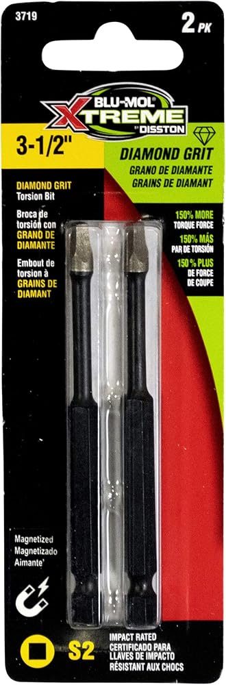 DISSTON Blu-Mol Xtreme Diamond Grit Torsion Bit that produces 150% more torque force. It is impact rated and Magnetized. The Blu-Mol Xtreme Diamond Bit torsion bits provide 150% more torque force vs standard bits and the ability to drive or remove fasteners in any conditions. It has 18% more cycle life over standard bits. The Diamond Grit tip provides enhanced friction between insert bit tips and fasteners. It has a Hex Shank for quick change and no slip grip. It is impact rated for the ability to twist and flex under stress. Available in all sizes and lenghts