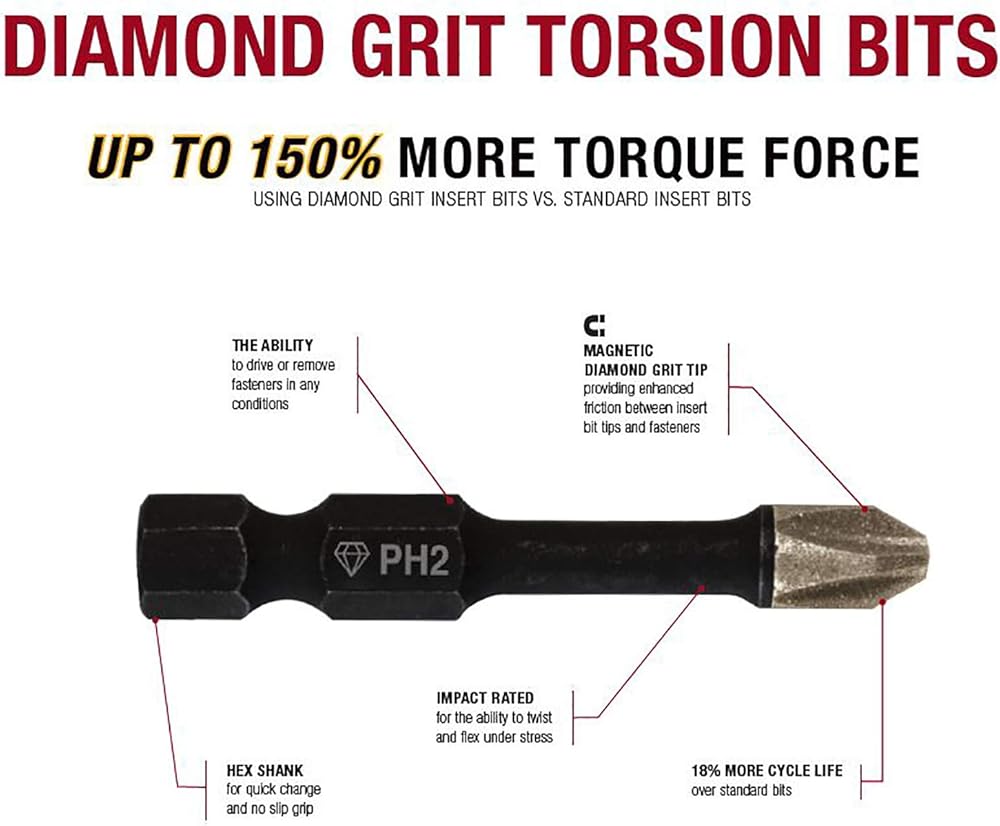The Diamond Grit tip provides enhanced friction between insert bit tips and fasteners