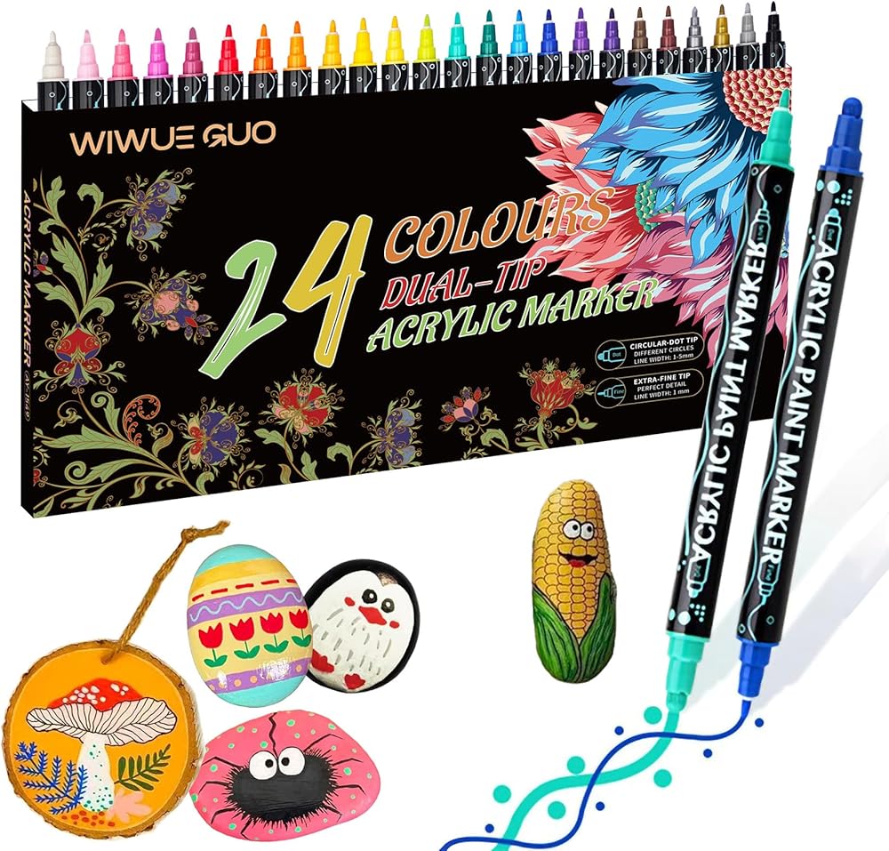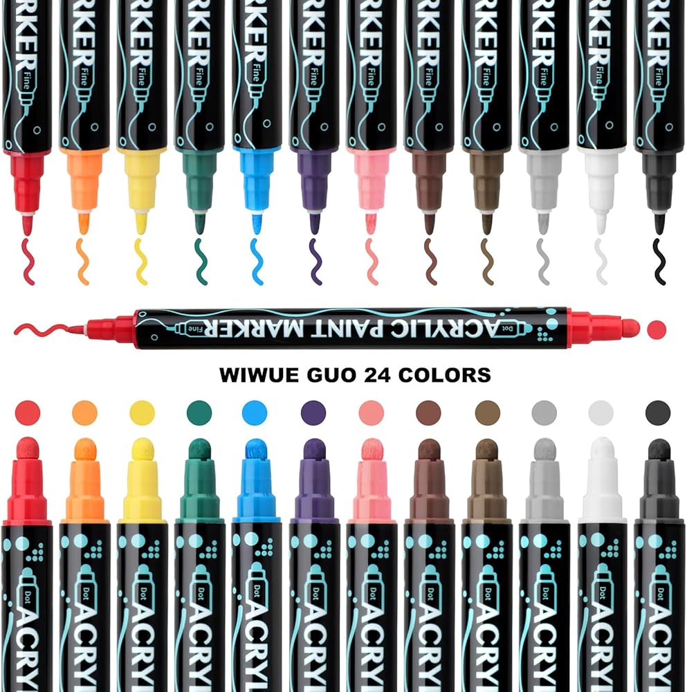 أقلام طلاء أكريليك 24 لونًا من WIWUE GUO، علامات طلاء أكريليك ذات طرف مزدوج مع طرف فرشاة وطرف رفيع، أقلام أكريليك للرسم الصخري، الخشب، الزجاج، السيراميك، القماش، الحرف اليدوية لصناعة اللوازم الفنية