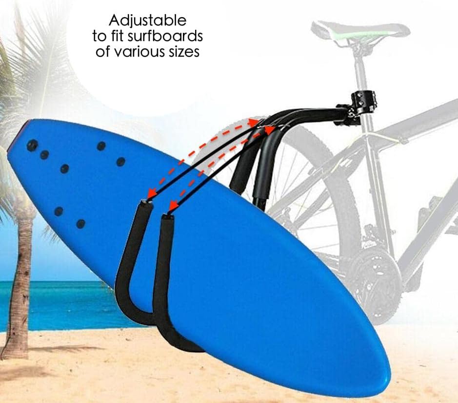 - يحتوي حامل لوح ركوب الأمواج على قضيب اتصال ممتد لإبقاء لوح ركوب الأمواج الخاص بك بعيدًا عن عجلة الدراجة، وهو غير ضار لكل من الدراجة ولوح ركوب الأمواج.