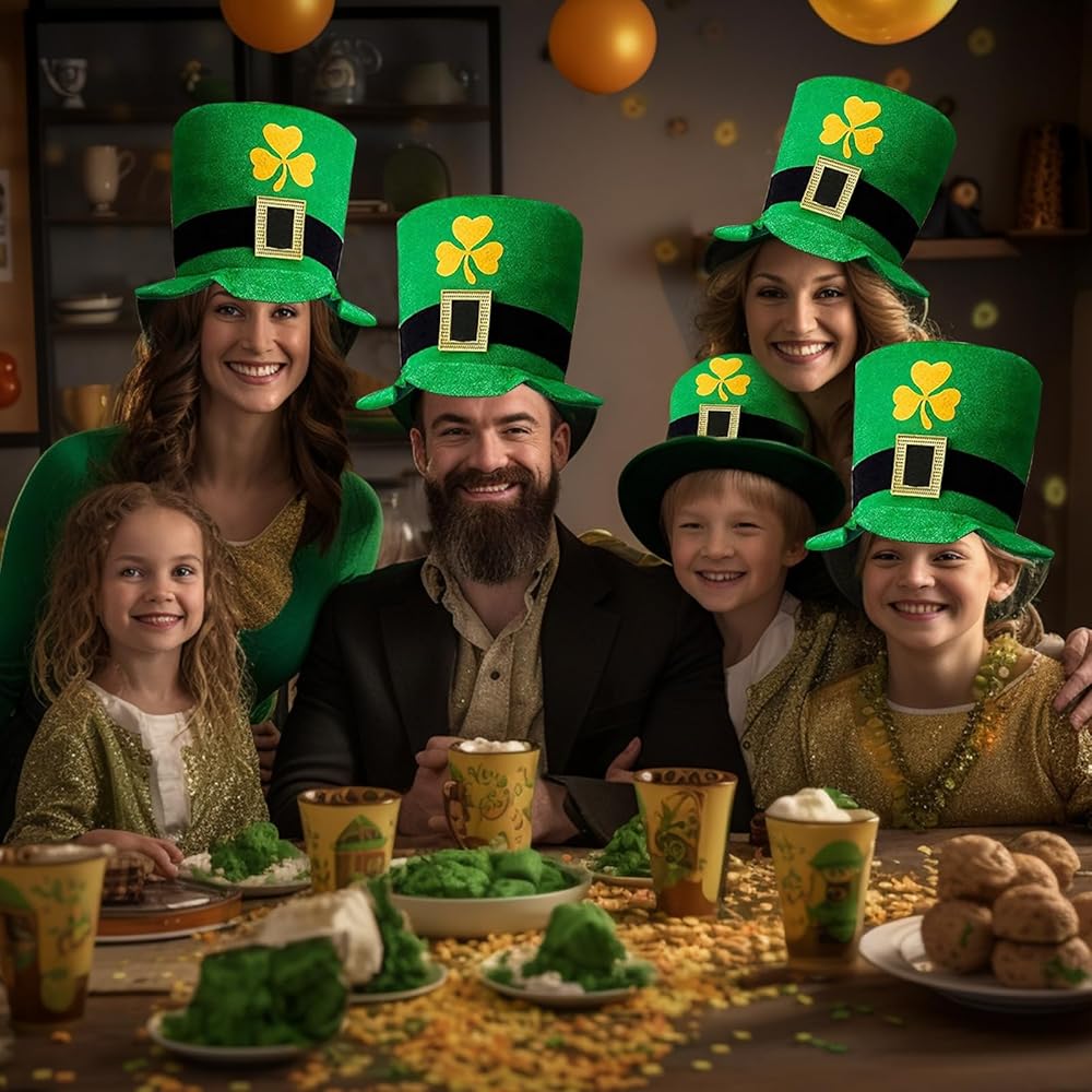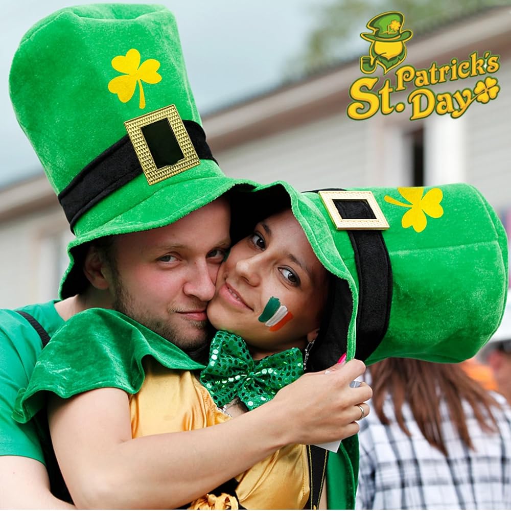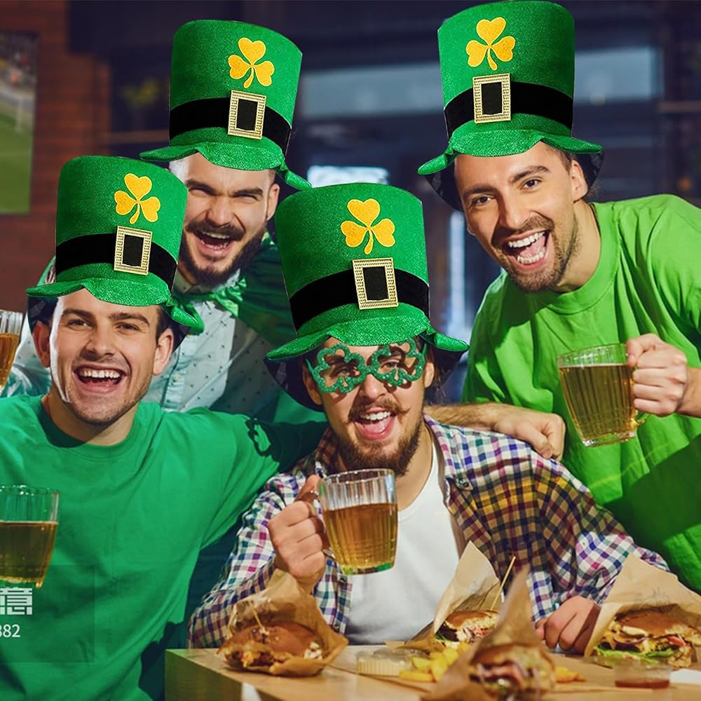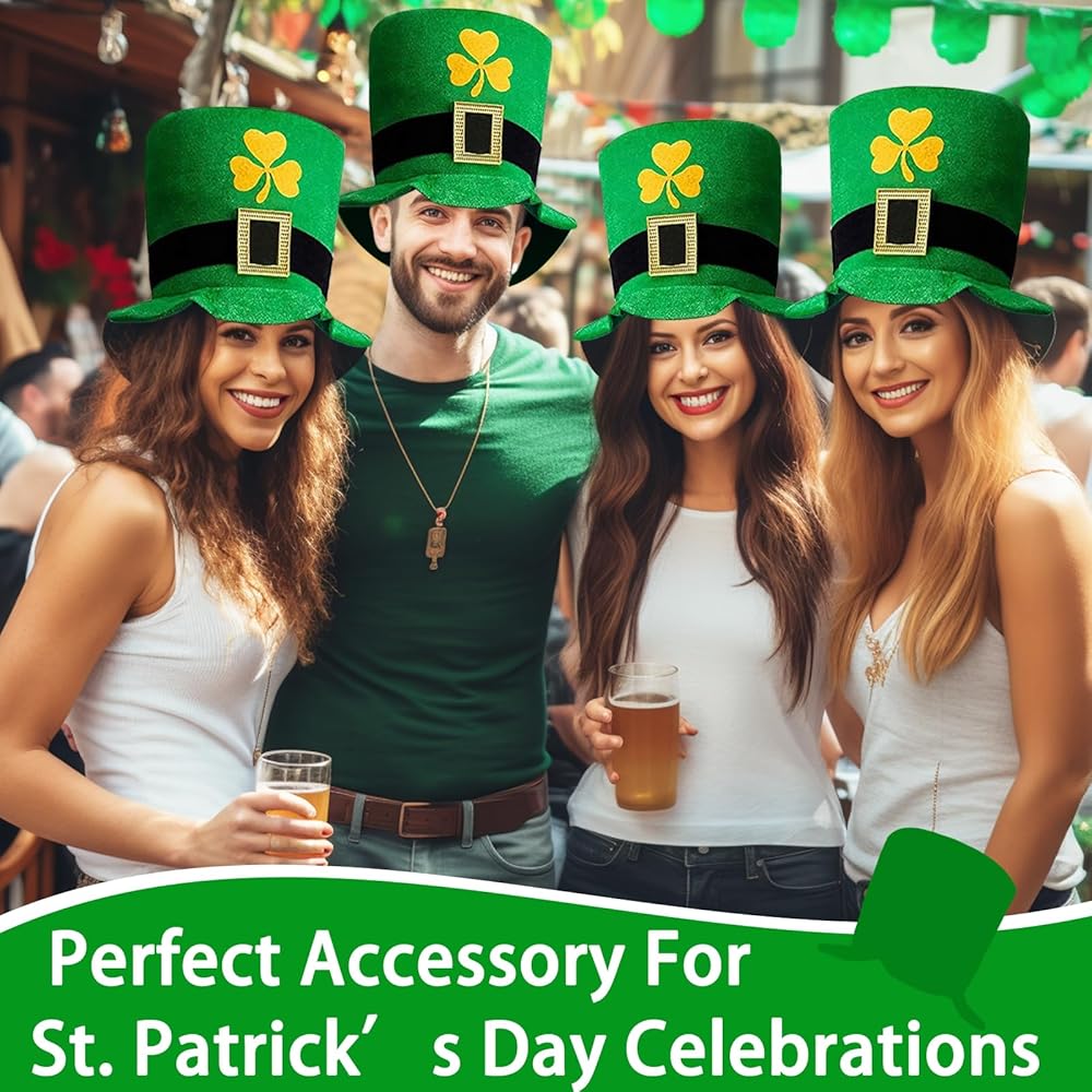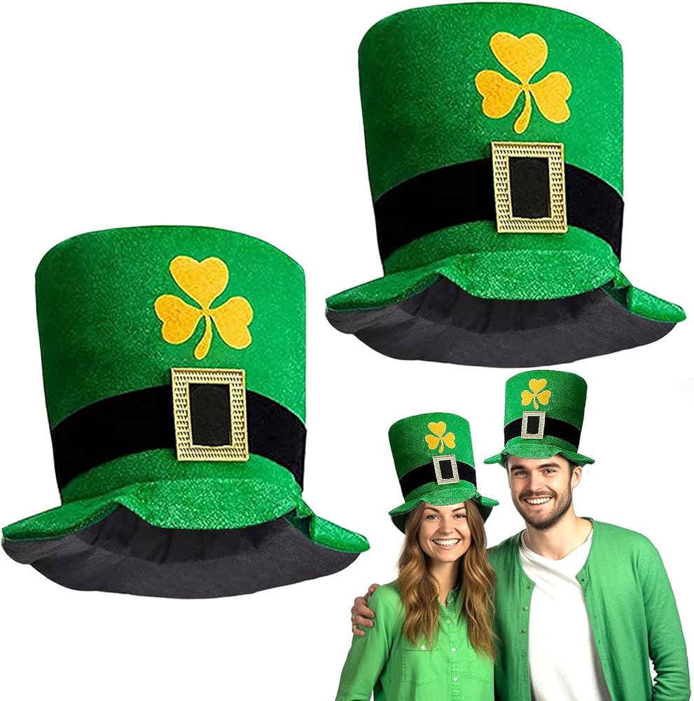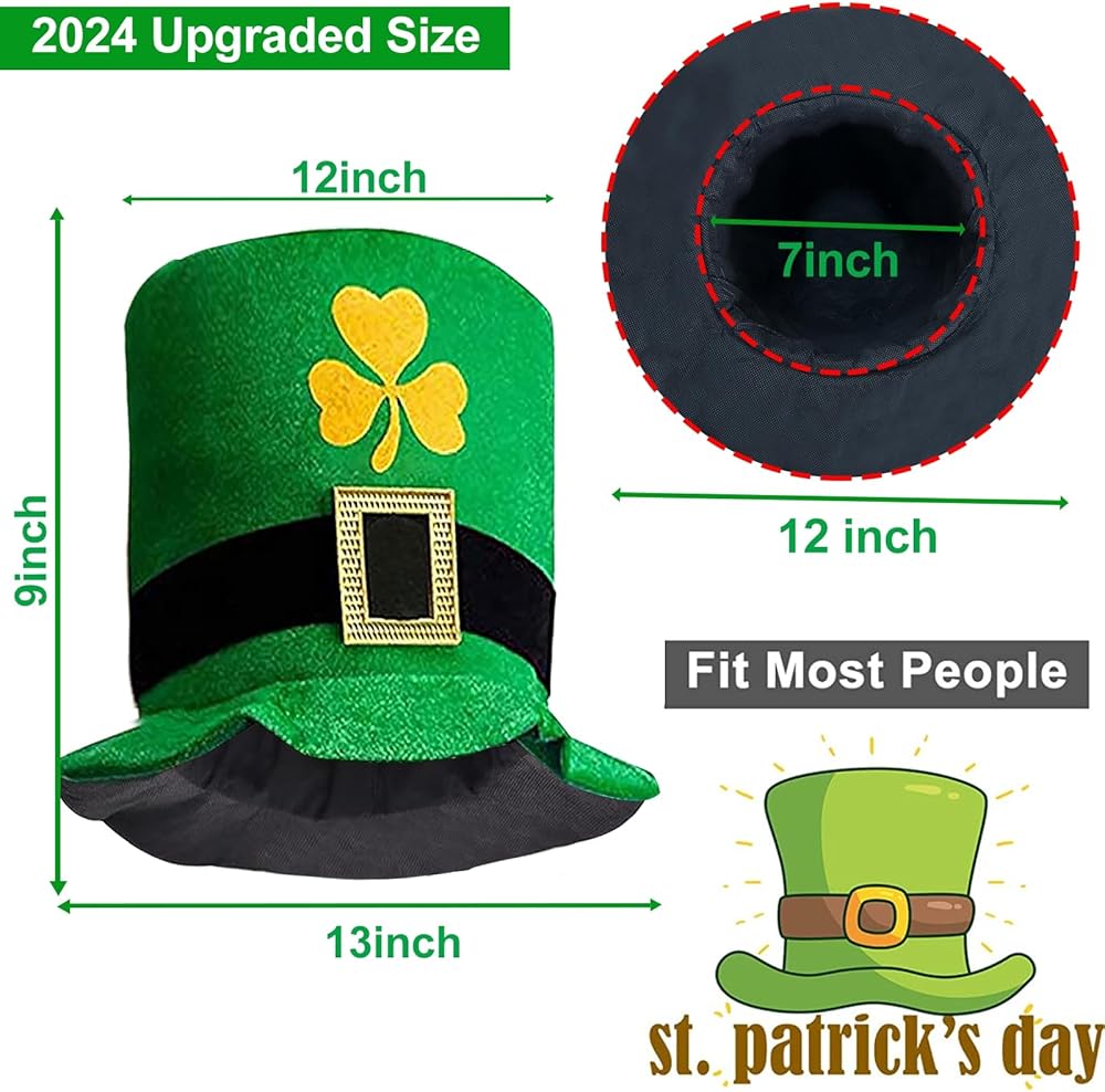 【عبوة من قطعتين من القبعة العلوية لحفلات عيد القديس باتريك 】 --- لا غنى عنها لحفلة عيد القديس باتريك مع قبعة خضراء من نبات النفل مع إبزيم ذهبي، إنها كبيرة ومريحة وبها نباتات النفل فوق الحافة - لذا ستكون المشي سحر الحظ السعيد! يتميز بمظهر أيرلندي حقيقي. رائع أيضًا لزي حفلة عيد القديس باتريك، أو مجرد شرب الويسكي في حانة أيرلندية.