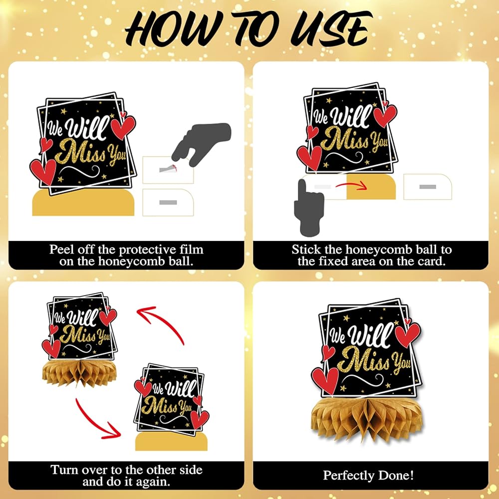 هذه الديكورات التي سنفتقدك هي إضافة لطيفة لحدثك، مع زخارف حفلات الوداع باللونين الأسود والذهبي، وعناصر جريئة وأنيقة لخلق جو حفل وداع لا يُنسى.