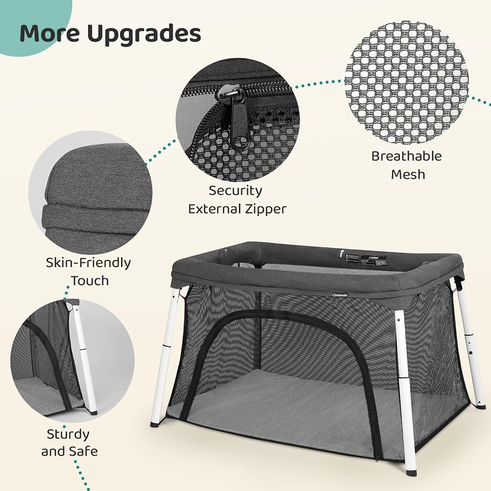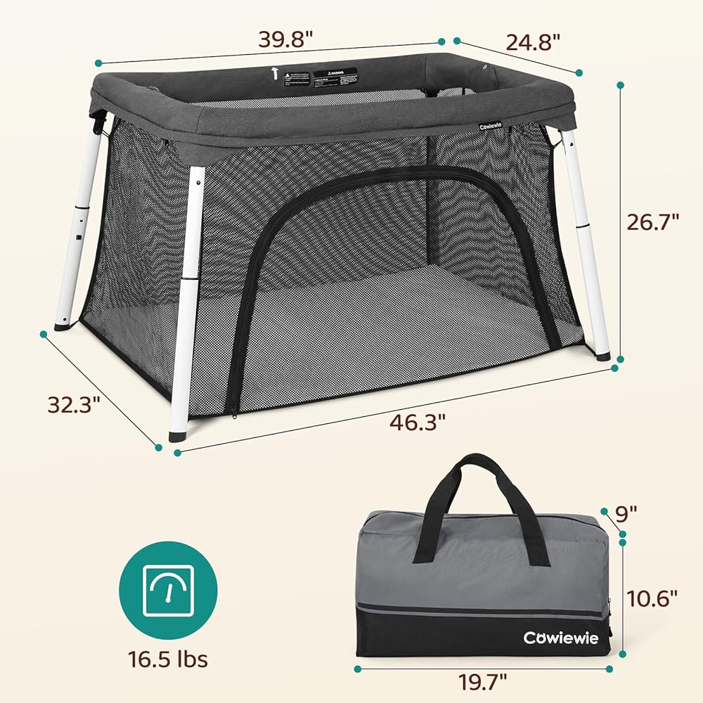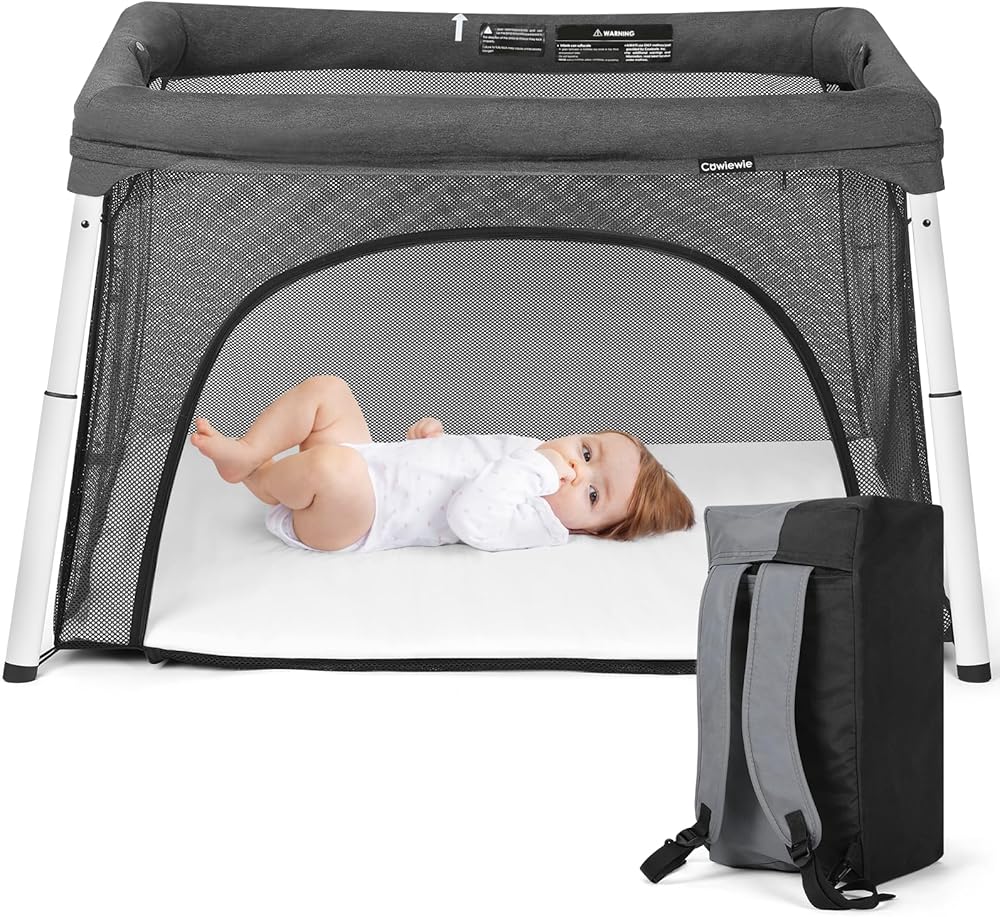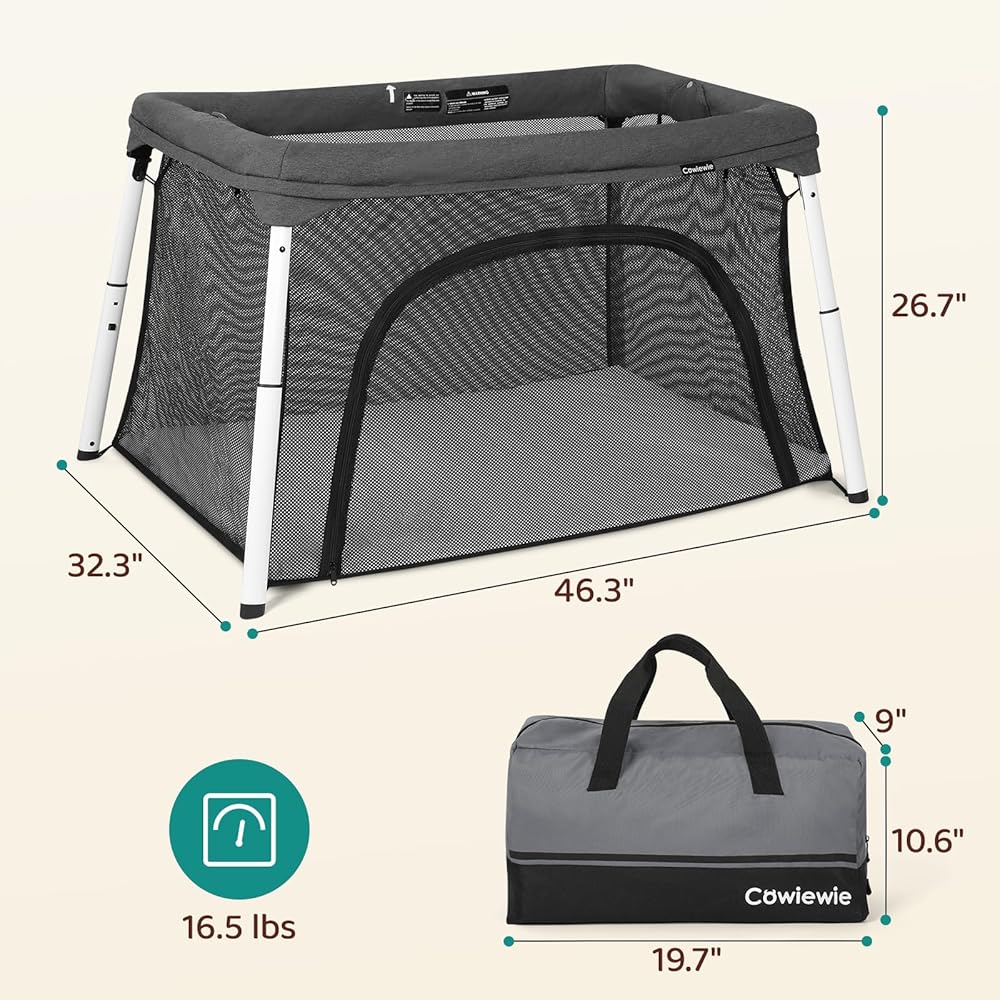 سرير أطفال للسفر وساحة لعب من Cowiewie، سرير أطفال محمول قابل للطي للأطفال الرضع والأطفال الصغار من سن 1 إلى 3 سنوات، روضة أطفال قابلة للتنفس وقابلة للغسل مع مرتبة مقاومة للماء، حقيبة ظهر صغيرة الحجم للسفر - رمادي داكن