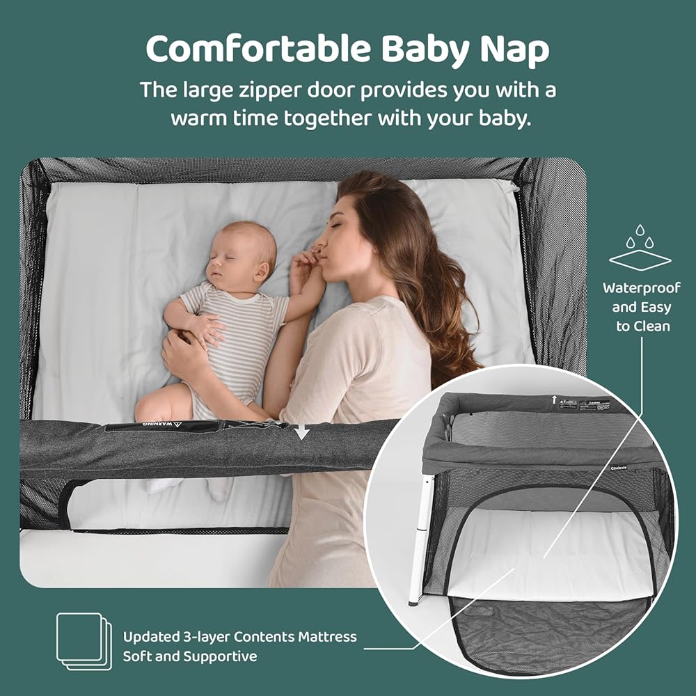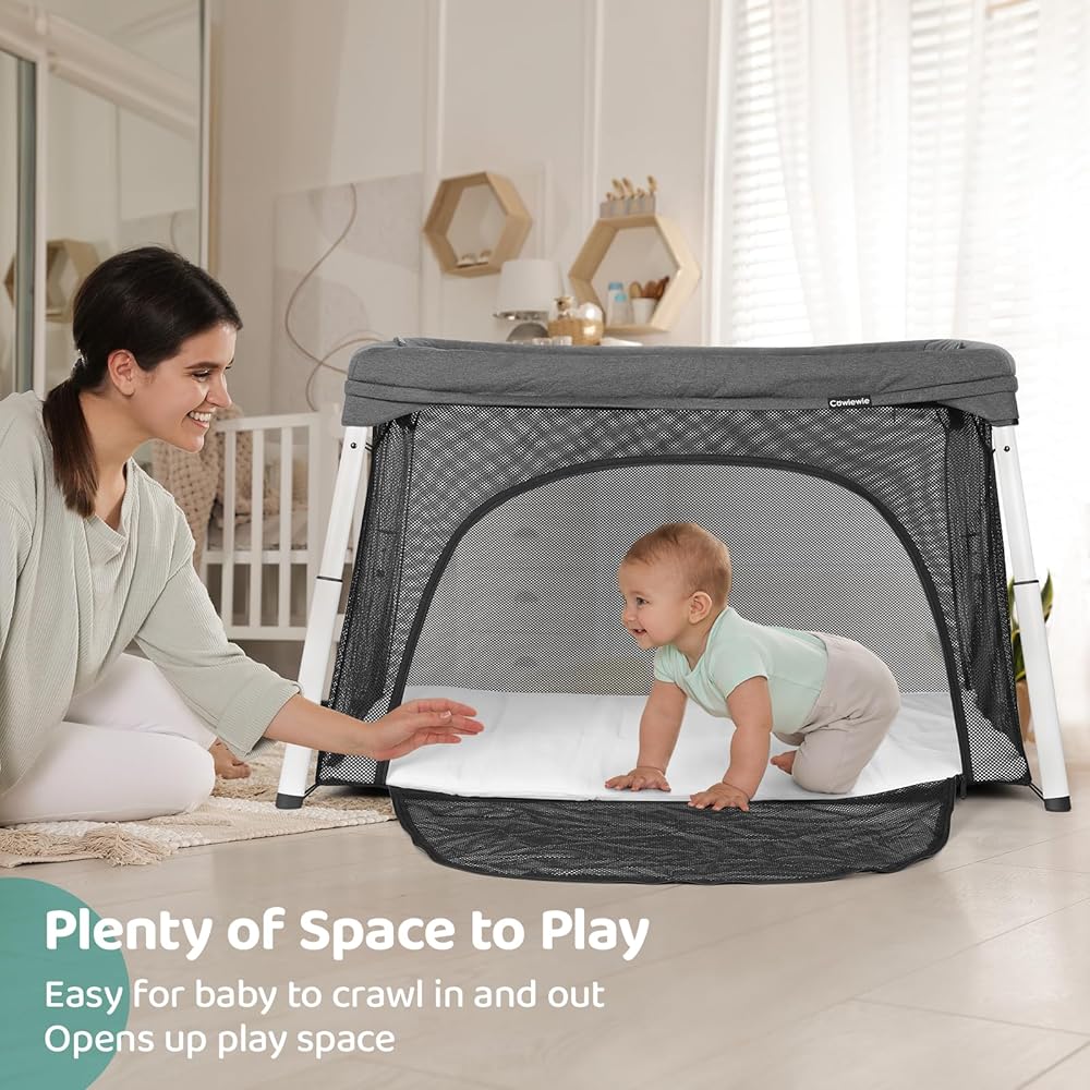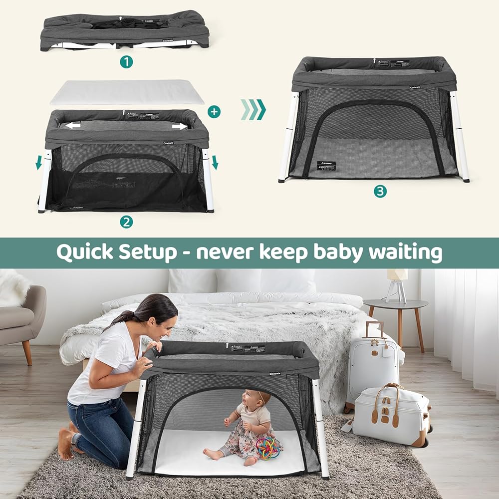 سرير أطفال للسفر وساحة لعب من Cowiewie، سرير أطفال محمول قابل للطي للأطفال الرضع والأطفال الصغار من سن 1 إلى 3 سنوات، روضة أطفال قابلة للتنفس وقابلة للغسل مع مرتبة مقاومة للماء، حقيبة ظهر صغيرة الحجم للسفر - رمادي داكن
