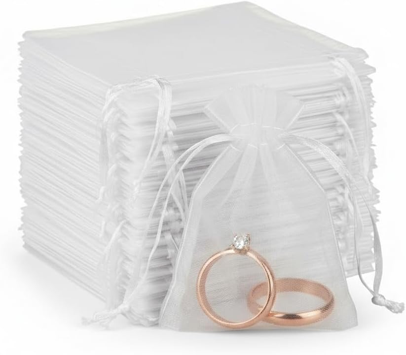 أكياس Sukh 100 من الأورجانزا البيضاء مقاس 3 × 4 بوصة - كيس أورجانزا صغير للمجوهرات وحقائب هدايا برباط وحقائب شبكية لعيد الحب وحفلات الزفاف وعيد مبارك وعيد الهالوين وعيد الميلاد وحفلات رأس السنة وحلوى الفاكهة بكميات كبيرة