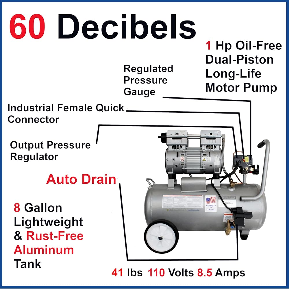 8010ALFCAD فائق الهدوء وخالي من الزيوت 1.0 حصان 8.0 جالون. ضاغط هواء خزان من الألومنيوم مع تصريف تلقائي
