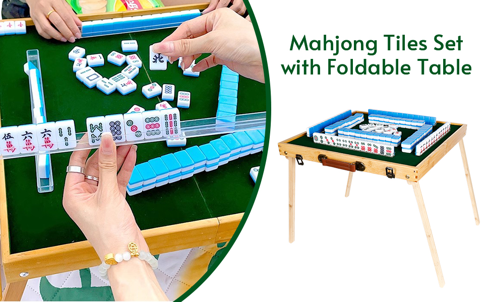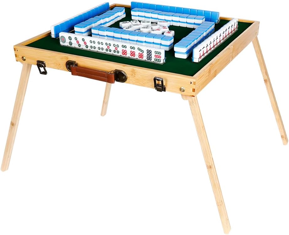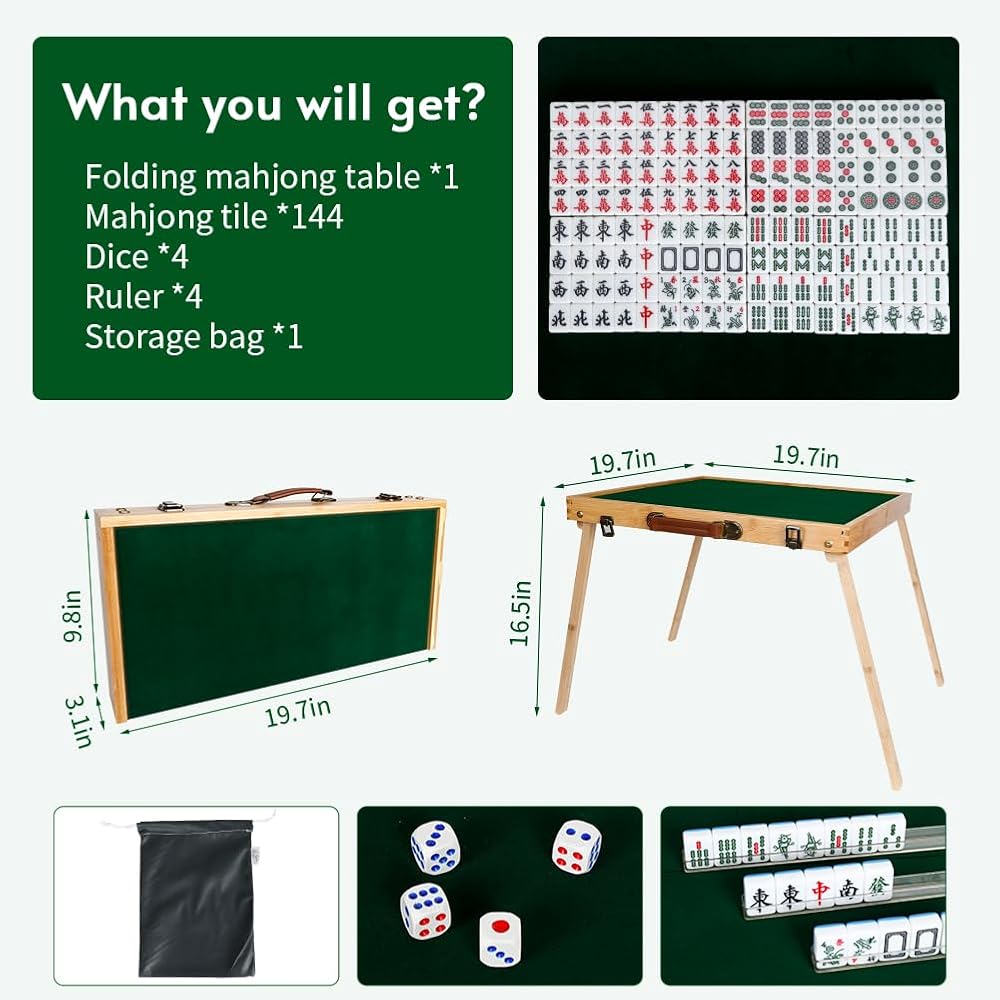 مجموعة طاولة ماجونج - يمكنك الحصول على 144 قطعة من بلاط ماجونج 30 مم، 2 * نرد، 4 * مساطر شفافة، 1 * حقيبة تخزين، 1 * طاولة ماجونج خشبية قابلة للطي.