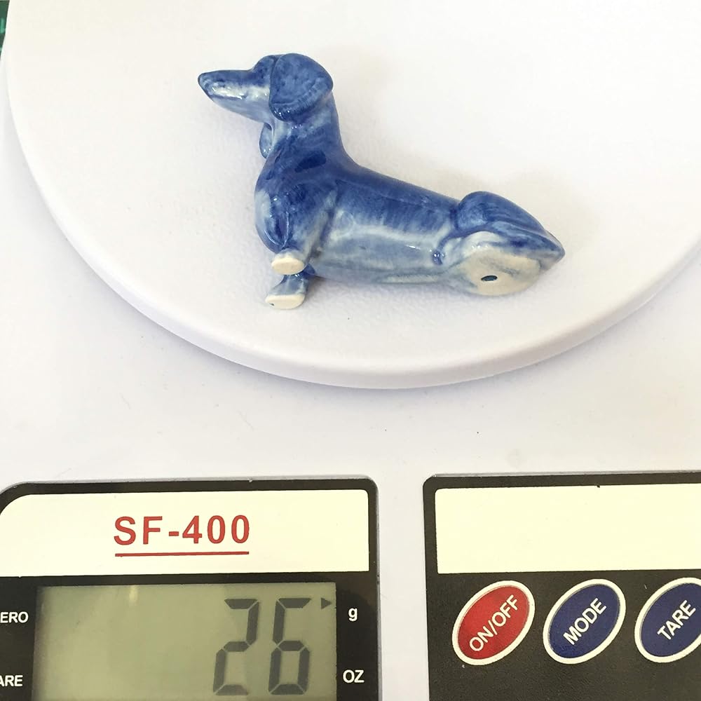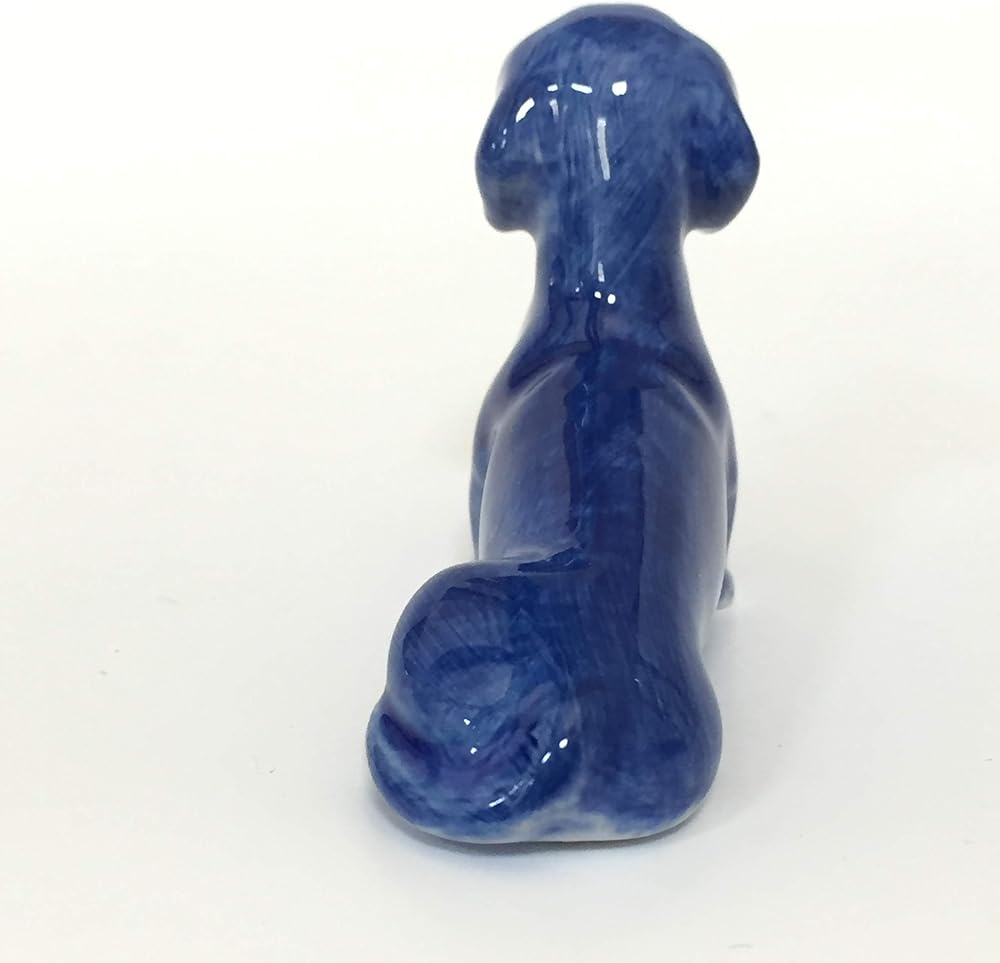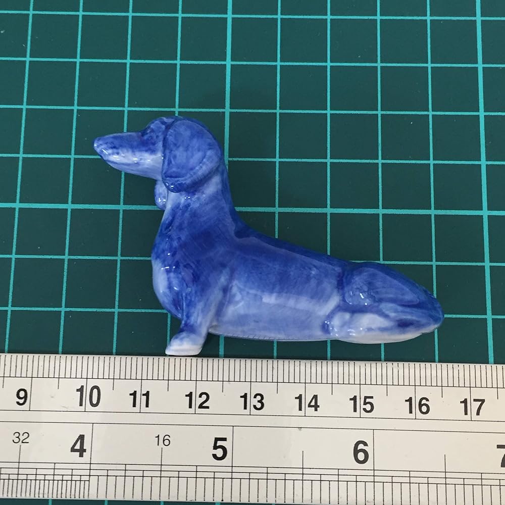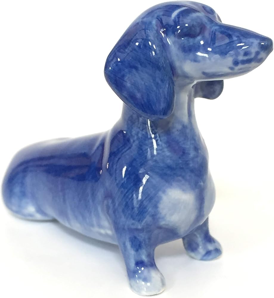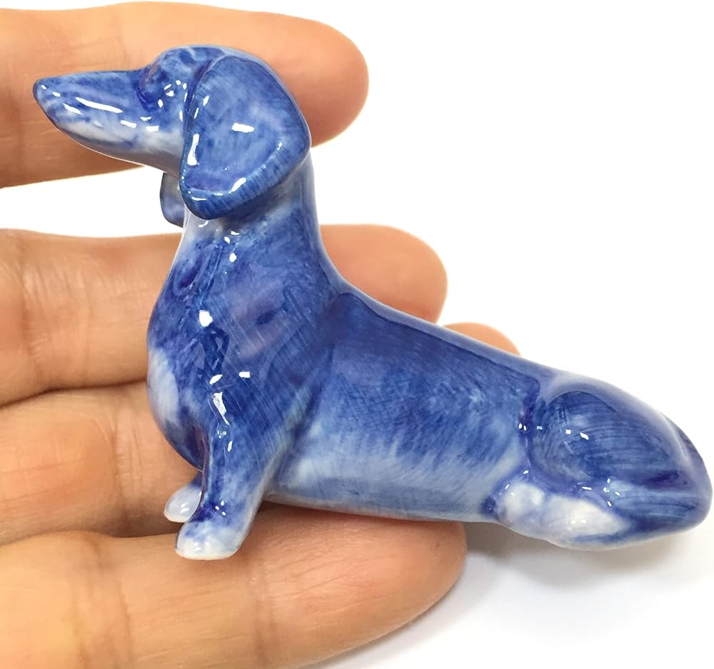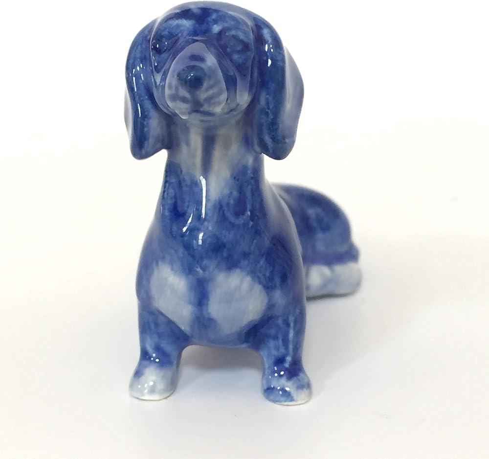 ceramic dachshund dog figurine dollhouse delft blue white collectible miniature bonsai garden handmade painted gift Beautiful cute pet collection sit