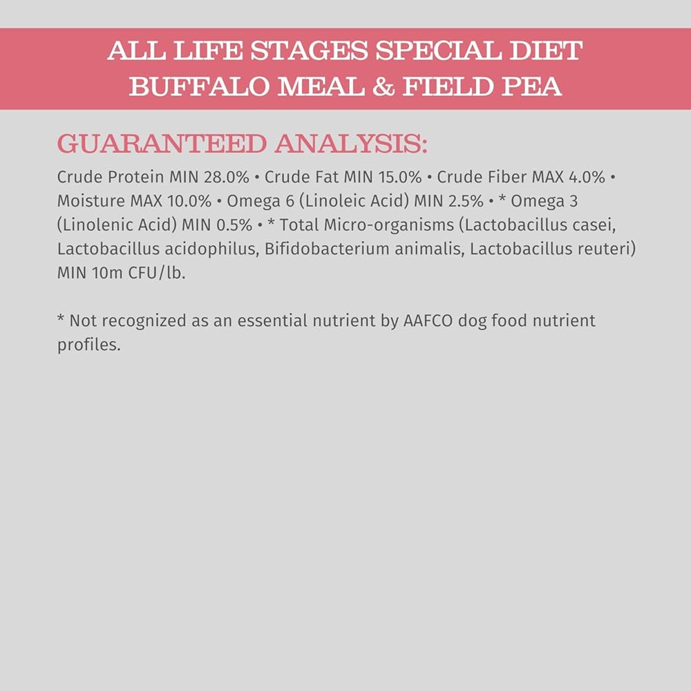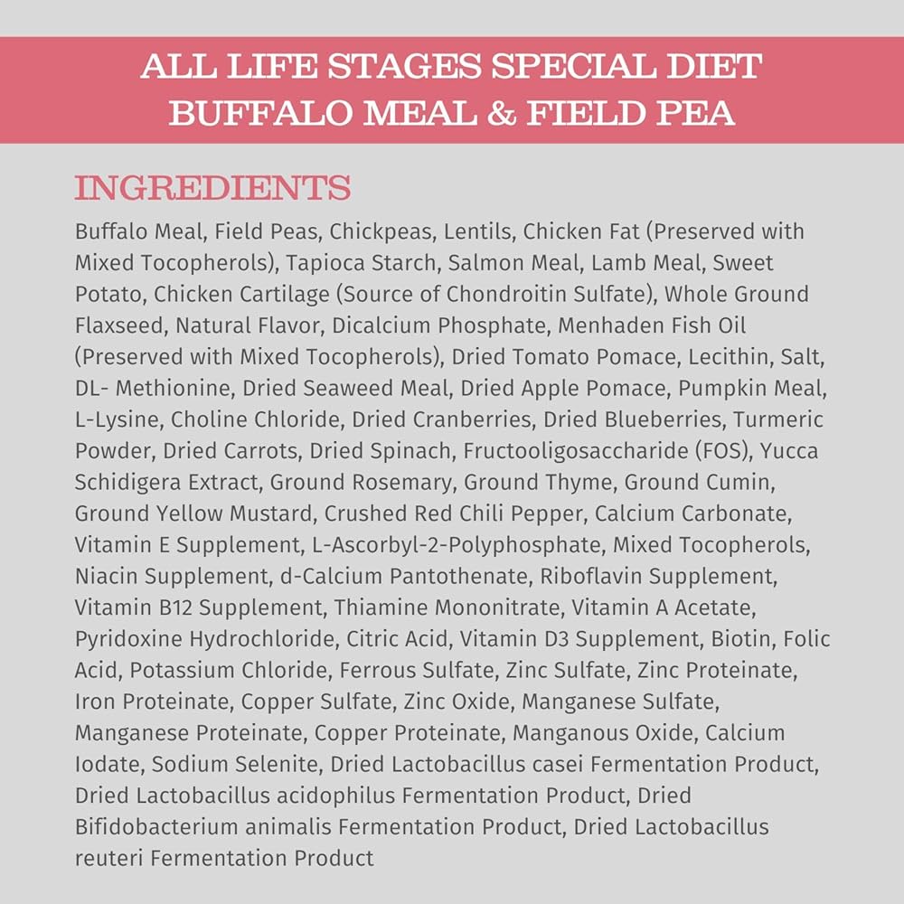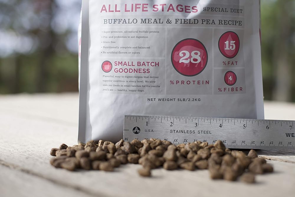 GRAIN FREE DOG FOOD FOR FOOD SENSITIVITIES - Slow cooked and handcrafted with the natural goodness of buffalo, field pea, carrot, and spinach. Our dog food never contains corn, wheat, or soy, so it is a perfect solution for dogs with food sensitivities.