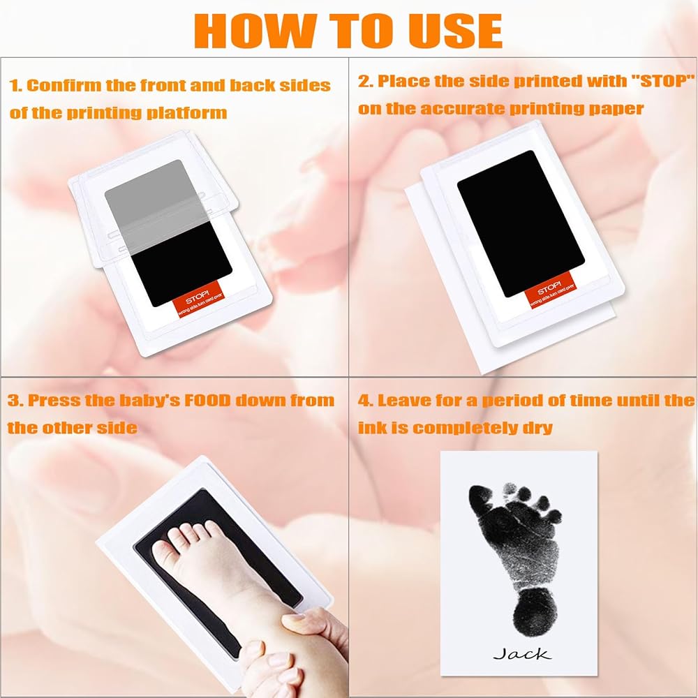 How to use:This baby and dog impression print kit is very simple to use.After removing the printing pad from the packaging,place the STOP printed side of the printing pad on the standard printing paper,and press down the palm of a child or pet on the other side to obtain a beautiful handprint.