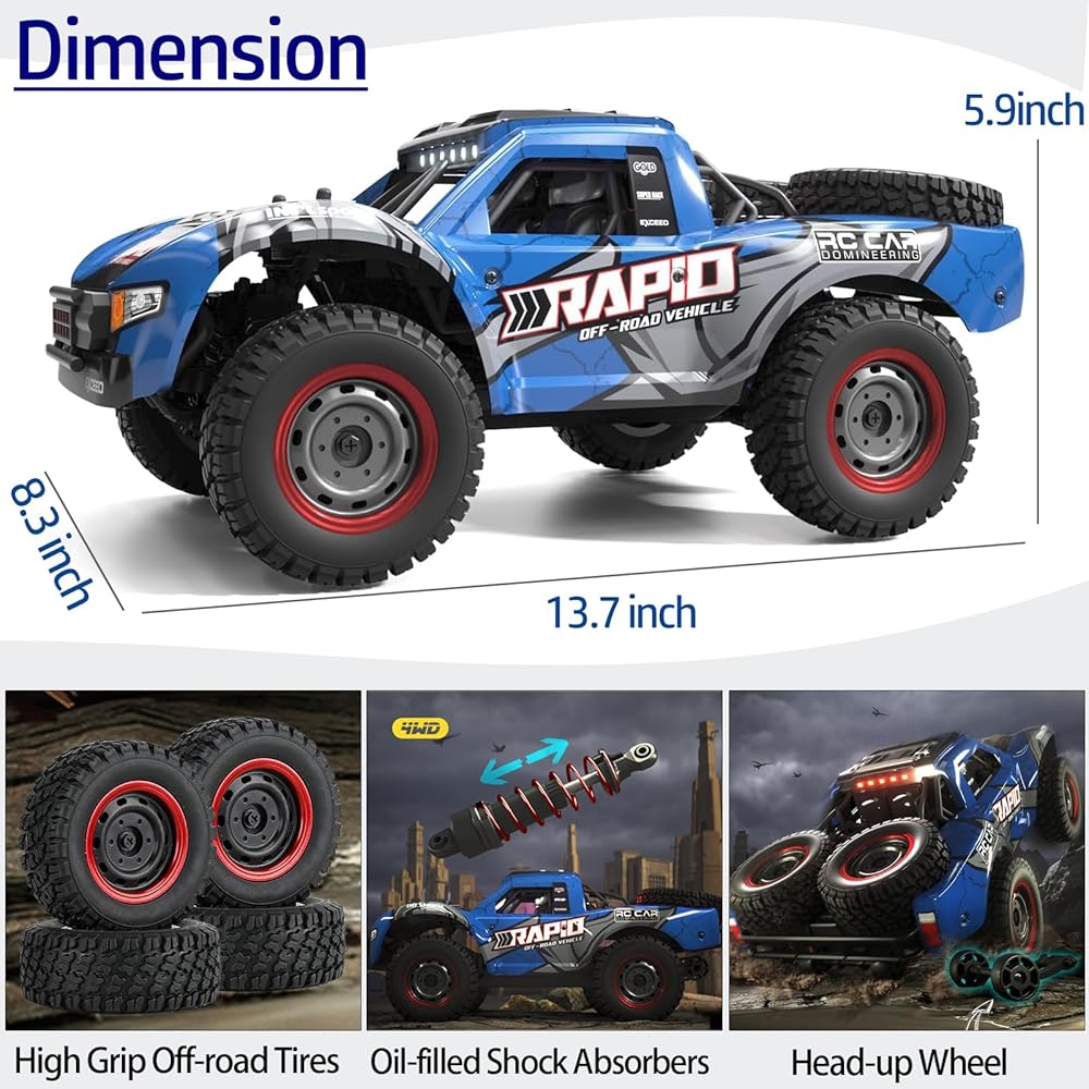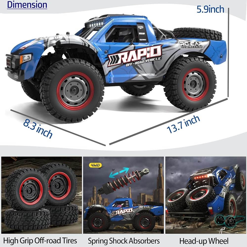 【هيكل الجسم المقوى】 سيارة التحكم عن بعد مصنوعة من مواد معدنية وبلاستيكية عالية الجودة. تم تجهيز الإطارات والعجلات الأربعة بامتصاص الصدمات الزنبركي المستقل، والذي يمكنه تخفيف الطرق الوعرة على الطرق الوعرة. لن تتضرر بسهولة