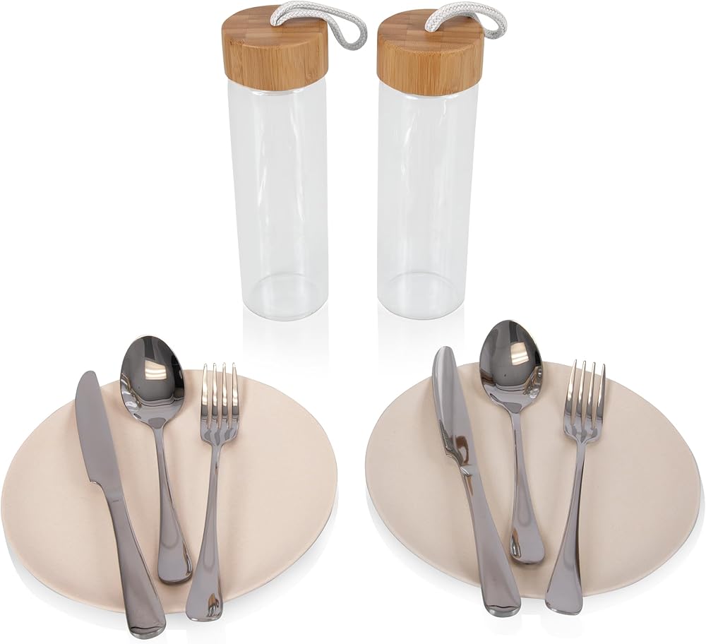 THOUGHTFUL DESIGN - The component pocket in this soft cooler bag includes two sets of stainless steel utensils, two recycled plant fiber plates and two glass water bottles with bamboo lids