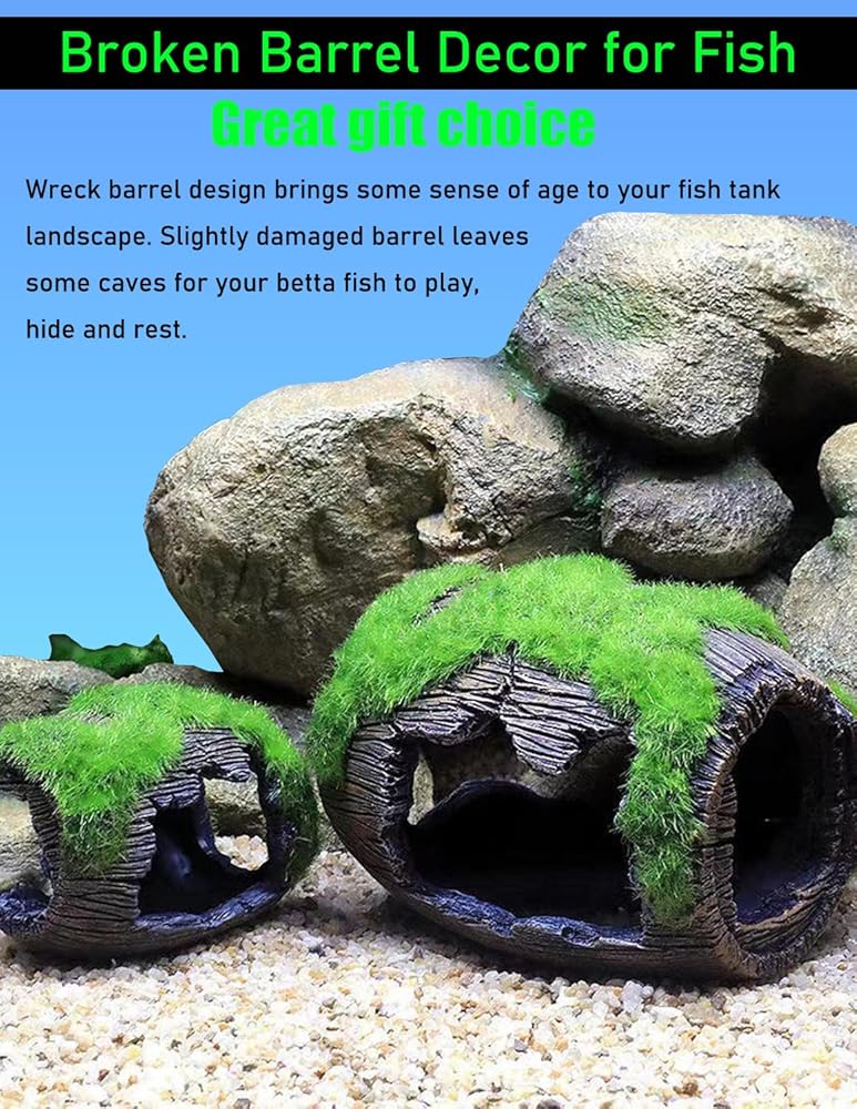 【Nice appearance】 Wreck barrel design brings some sense of age to your fish tank landscape. Slightly damaged barrel leaves some caves for your betta fish to play, hide and rest. It is a fantastic toy for your pet fish.