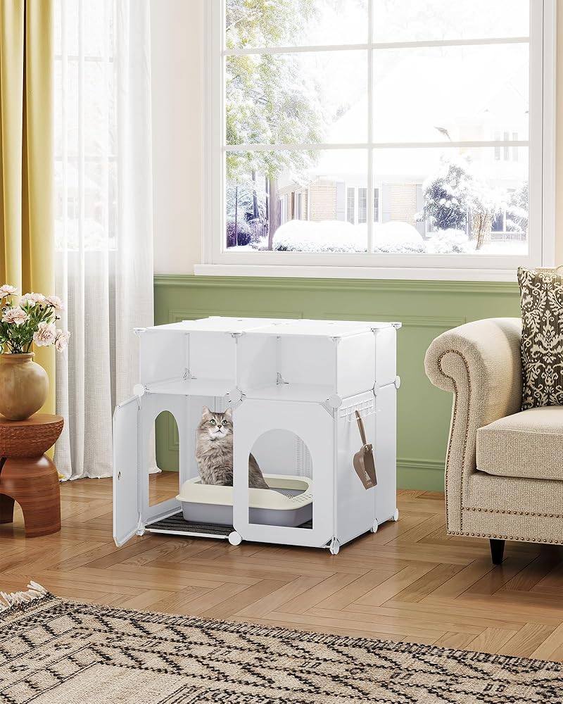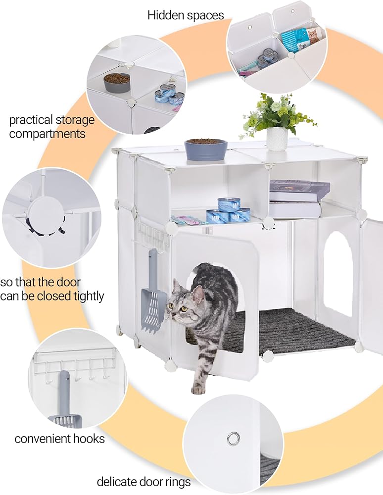 • [خطافات إضافية لتلبية احتياجاتك] نحن مجهزون بخطاف لتعليق الأدوات مثل المجرفة الصغيرة لتنظيف قطتك، حتى تتمكن من وضعها في متناول يدك من أجل الراحة والحفاظ على صندوق الفضلات نظيفًا وعديم الرائحة، حتى تتمكن من يمكن أن تقع قطتك في حب منزلها. (المنتج الذي تستلمه لا يشمل المغرفة)