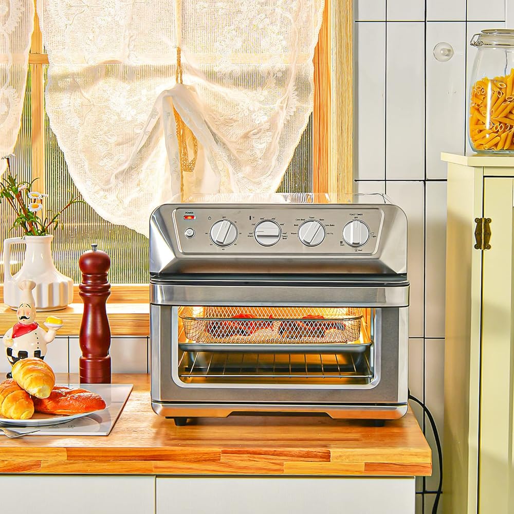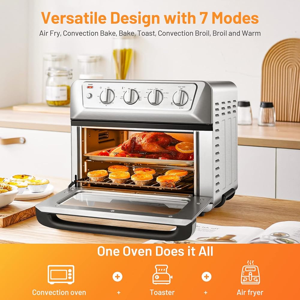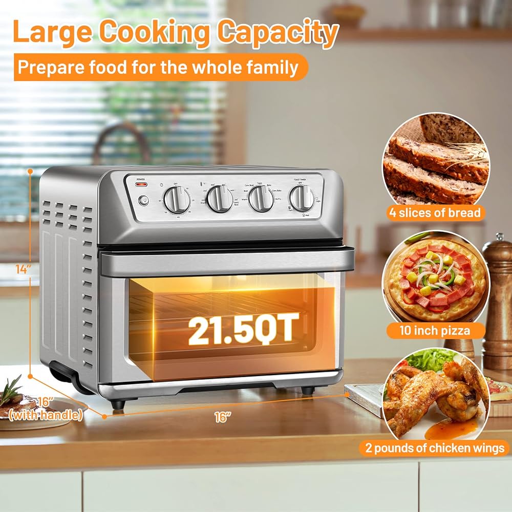 سعة كبيرة 21.5 كيو تي: مصممة بقدرة طهي كبيرة، هذه المقلاة الهوائية المصنوعة من الفولاذ المقاوم للصدأ قادرة على تحميص 4 شرائح من الخبز، أو خبز بيتزا مقاس 10 بوصات أو قلي 2 رطل من أجنحة الدجاج. سيوفر لك الوقت عند طهي الطعام.