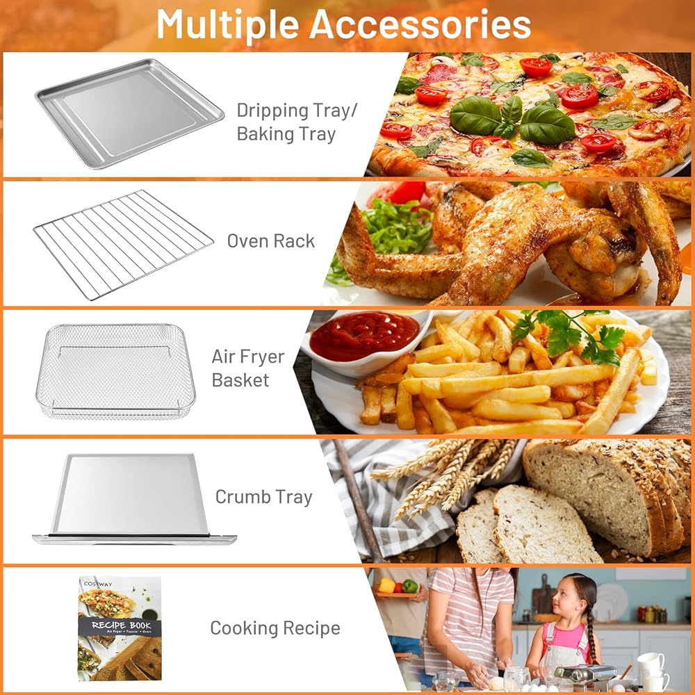 5 ملحقات عملية لا يمكن غسلها في غسالة الأطباق: يأتي فرن سطح الطاولة مزودًا برف فرن خالٍ من غسالة الأطباق وسلة مقلاة هوائية وصينية تقطير وصينية فتات قابلة للسحب، مما يوفر لك المزيد من إمكانيات الطبخ المنزلي. يتم أيضًا تضمين وصفة طعام لمزيد من المهارات.