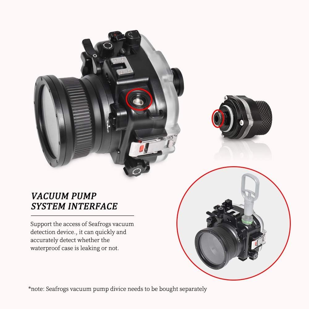 منفذ نظام مضخة ACUUM: متوافق مع نظام مضخة التفريغ Searogs VPS-100، للتحقق من إحكام الماء في غطاء الكاميرا تحت الماء قبل غمرها