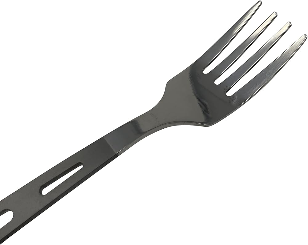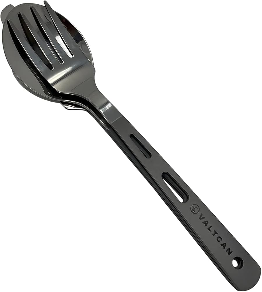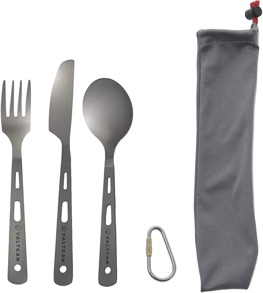 أدوات تخييم من التيتانيوم مكونة من ثلاث قطع بأطراف مصقولة - شوكة وسكين مسنن وملعقة. أدوات تخييم من التيتانيوم مكونة من ثلاث قطع - شوكة وسكين مسنن وملعقة. وزن الشوكة 13 جرام، والملعقة 17.2 جرام، والسكين 15.2 جرام، والوزن الإجمالي حوالي 45.5 جرام.