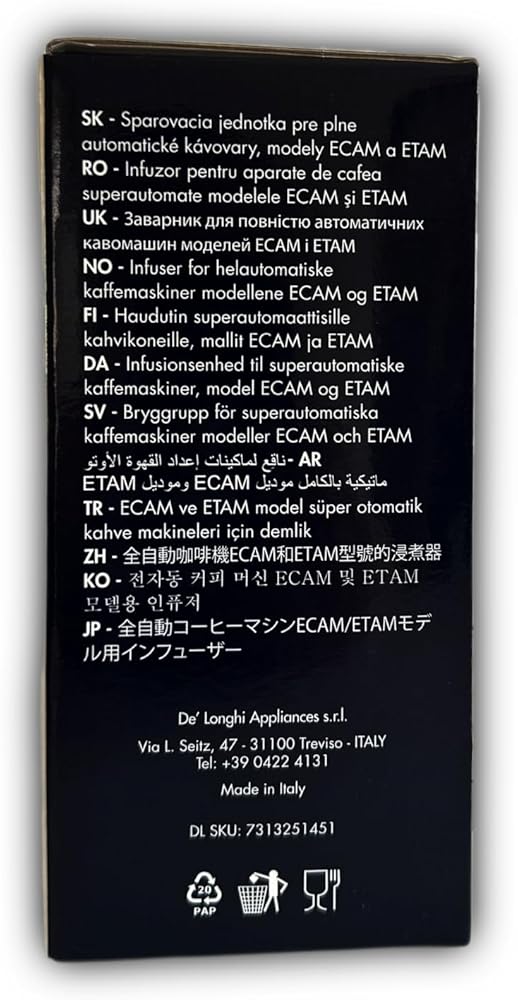 Brew unit - infuser for Delonghi automatic coffee machines ECAM, ETAM, SECAM, Magnifica, Cappucino, Prima Donna, Eletta, Dinamica, Autentica models. Part number 7313251451. To change the brew unit: open the the machine, compress the two red tabs and pull out of the unit. Please remove and wash the brew unit with water regularly, monthly. Do not use any detergents, dishawasher or any other chemicals.