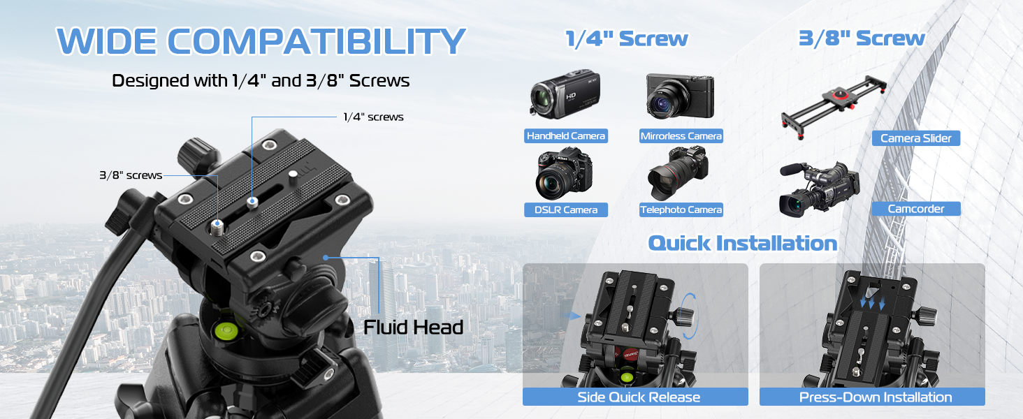 • تركيب سريع لكاميرا الأمان: يعتمد الرأس السائل على الضغط الجانبي سريع التحرير. بالضغط على زر التحرير الجانبي ومقبض الضبط، يتم تجميع الكاميرا وتفكيكها بسرعة وأمان. تتضمن لوحات فك سريع 1/4"-20 و3/8"-16 (مع مفتاح ربط مدمج) متوافقة مع مجموعة متنوعة من كاميرات DSLR، والكاميرات التي لا تحتوي على مرايا، وكاميرات الفيديو، والجيمبال، وأجهزة الفيديو، والمزيد
