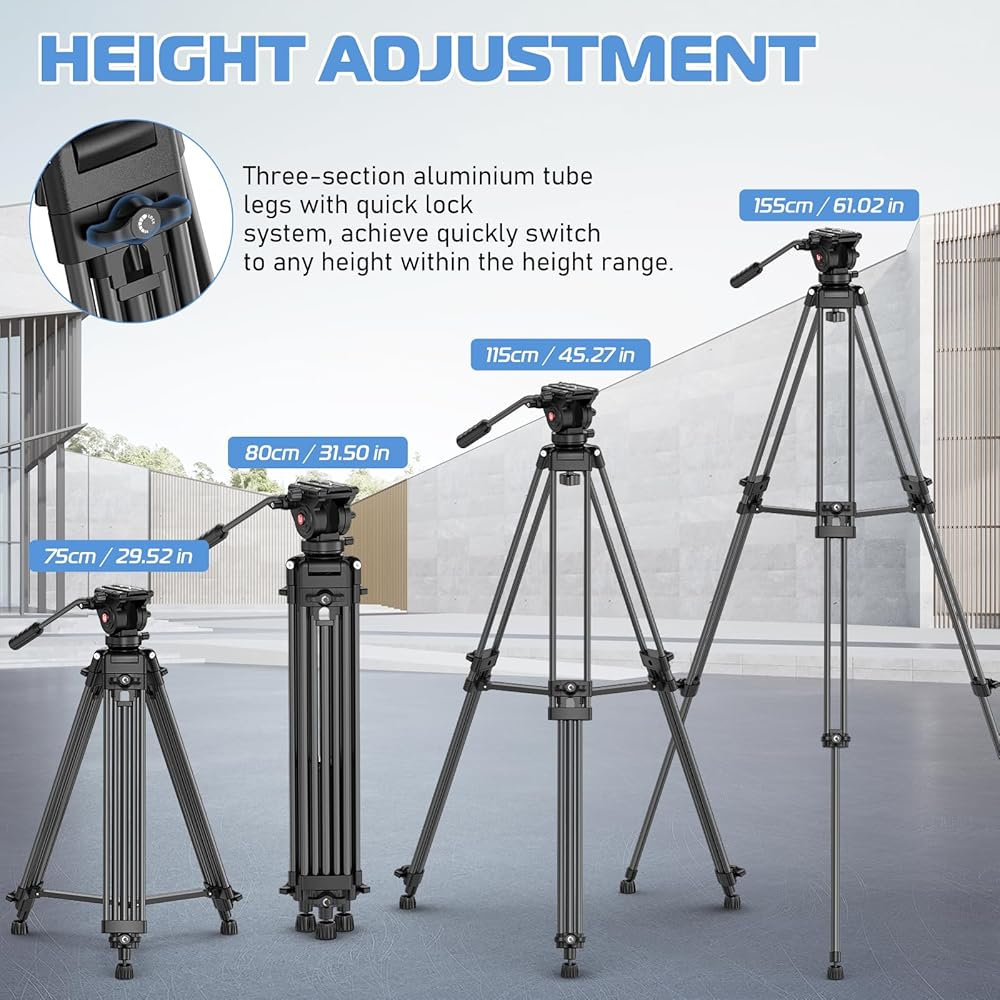 • يمكنك ضبط الارتفاع بسهولة: قم بتمديد الحامل ثلاثي القوائم من الحد الأدنى للارتفاع وهو 29.52 بوصة/75 سم إلى 61.02 بوصة/155 سم وقم بتثبيته باستخدام القفل القلاب. يمكن طي الأرجل المتداخلة حتى 31.50 بوصة/80 سم ويمكن وضعها داخل حقيبة اليد لسهولة التخزين والنقل. يمكن ضبط شد القفل القلاب عبر المفتاح السداسي على شكل حرف L