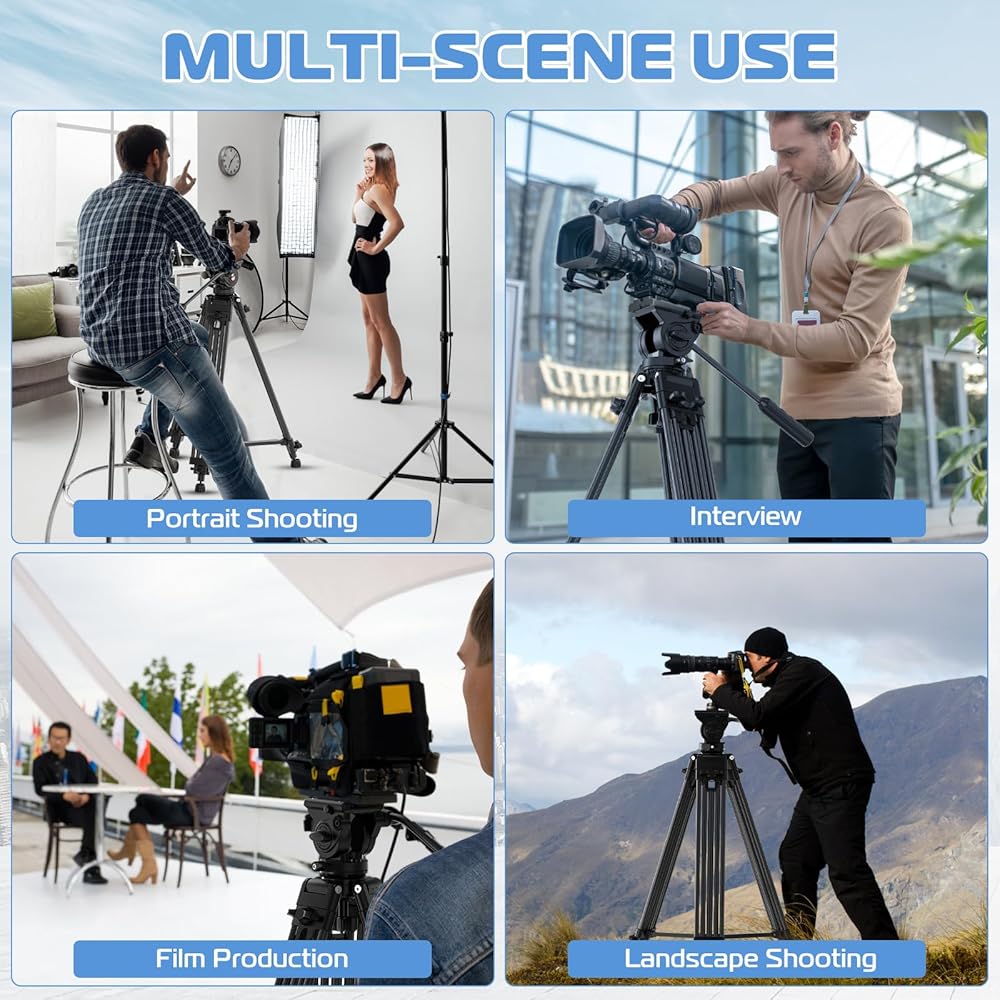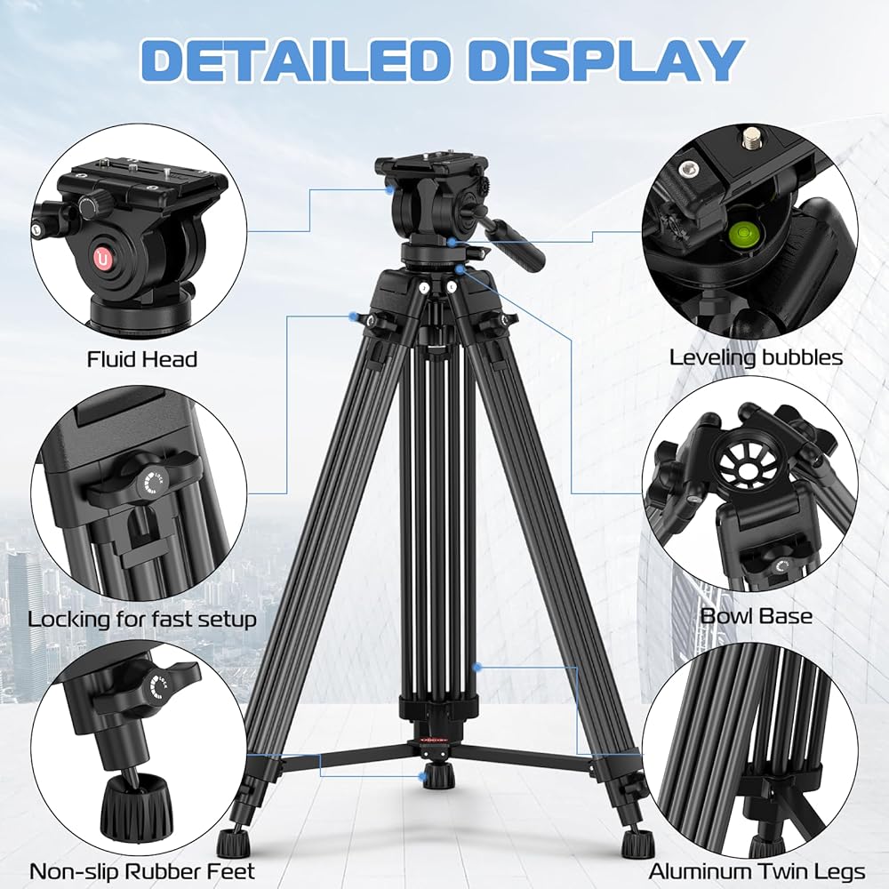 • حامل ثلاثي القوائم للفيديو العالمي: استخدم هذا الحامل ثلاثي القوائم عالي التحمل لتثبيت الكاميرا/كاميرا الفيديو الخاصة بك والتقاط صور ومقاطع فيديو واضحة للأحداث الرياضية وحفلات الزفاف والمناظر الطبيعية والأشخاص والمنتجات. يعمل الموزع ذو المستوى المتوسط ​​على زيادة الثبات ويسمح بوضع أكياس الرمل (تباع بشكل منفصل). أقصى سعة تحميل: 17.6 رطل (8 كجم)