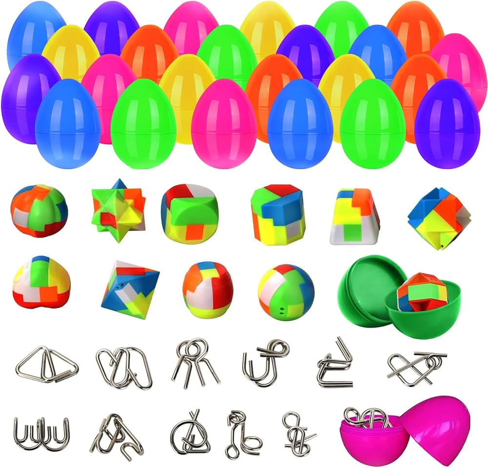 🎁مجموعات ألعاب صيد بيض عيد الفصح: 24 عبوة من بيض عيد الفصح مع ألعاب ألغاز تحفيز العقل للأطفال، تحتوي جميعها على مجموعة متنوعة من الألعاب مثل الأسلاك المعدنية، والألغاز الخشبية، وألغاز المكعبات البلاستيكية وما إلى ذلك. مجموعة بيض عيد الفصح البلاستيكية القابلة للحشو توفر للأطفال متعة ومبهجة. تجربة مثيرة حيث يكتشفون عناصر جديدة منهم. استمتع بحفلة رائعة بطابع عيد الفصح مع بيضة عيد الفصح من IKUKUER!