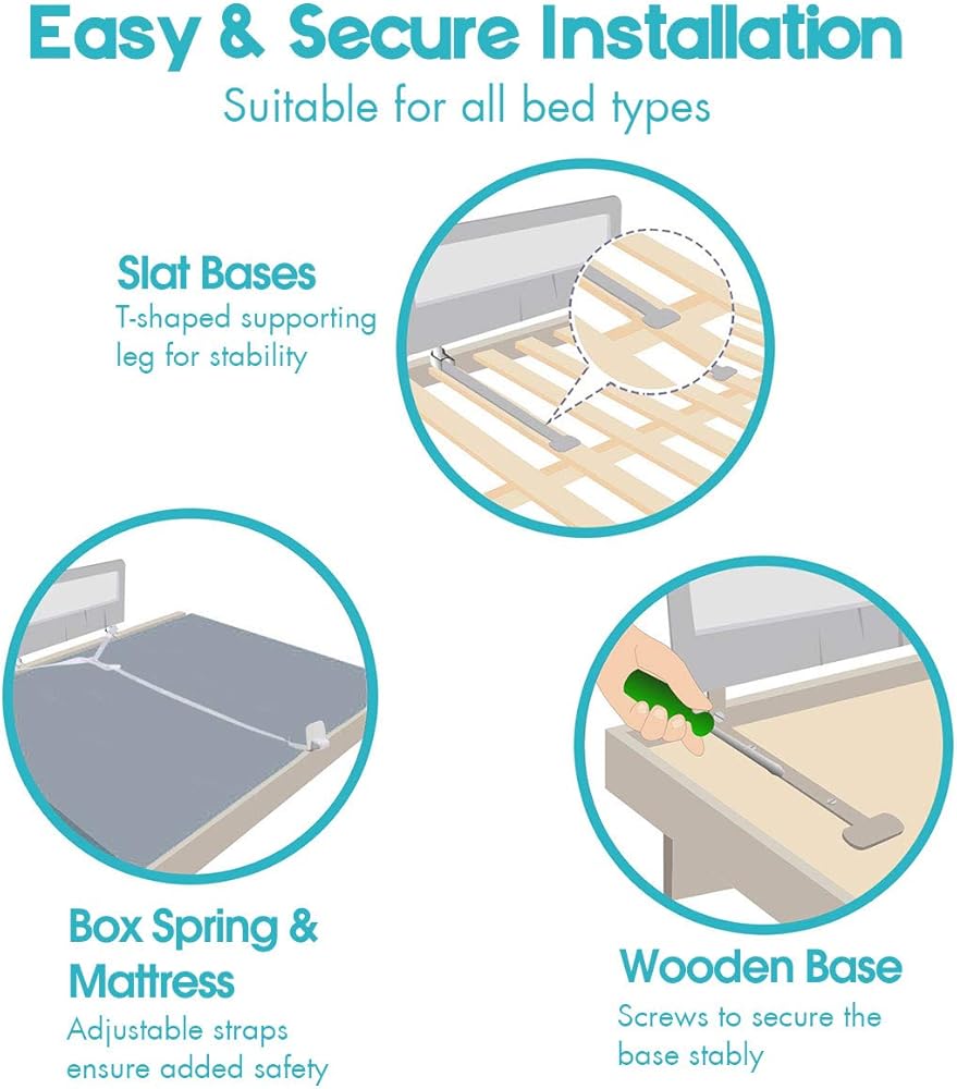 [عالمي لمعظم الأسرّة]: يعمل حاجز السرير الآمن متعدد الوظائف بشكل جيد مع أي نوع من الأسرّة، بما في ذلك قواعد الشرائح والمراتب والزنبركية أو حتى القاعدة الخشبية بالحبال أو الأشرطة أو البراغي. تحتوي كل لوحة على أبعاد 69 × 23 بوصة ويمكنك ضبطها على إطارات سرير قابلة للتحويل أو سرير مزدوج أو مزدوج أو كامل الحجم بحرية.