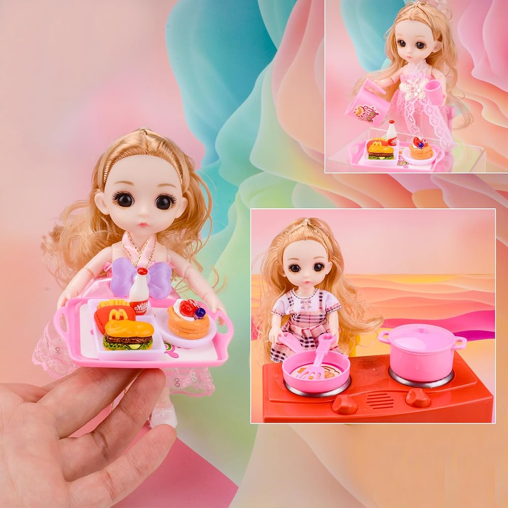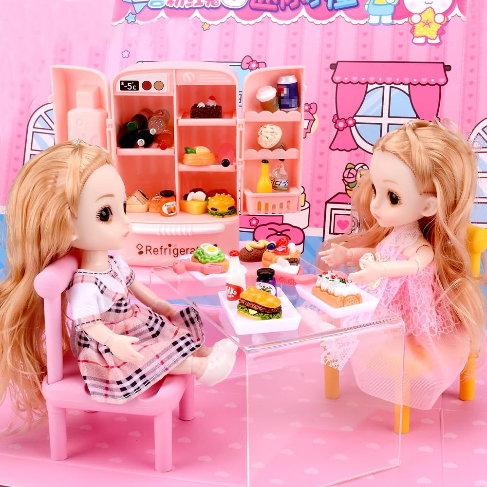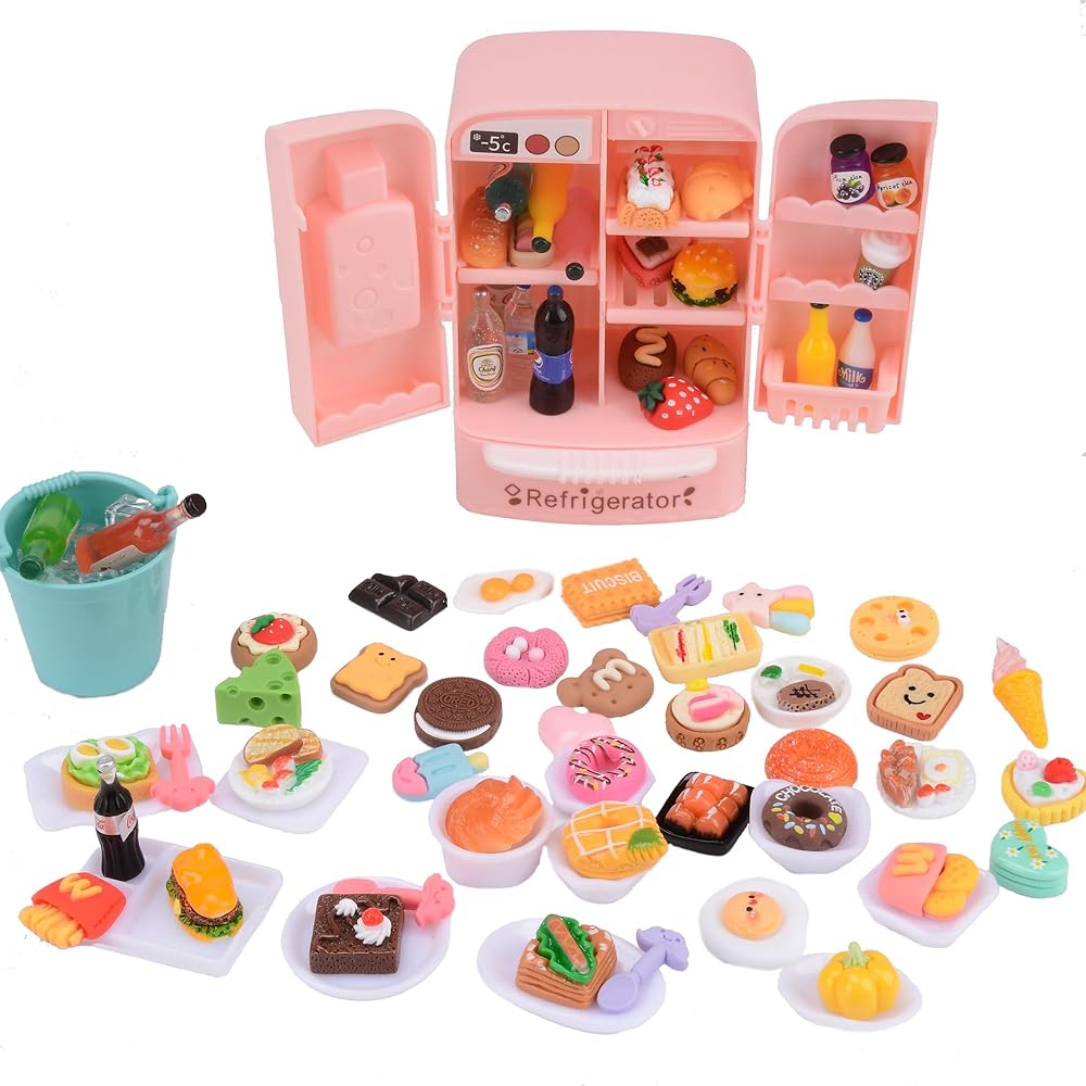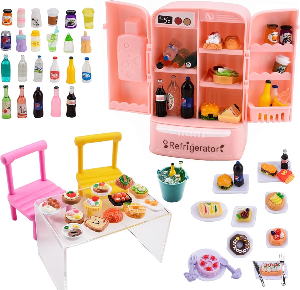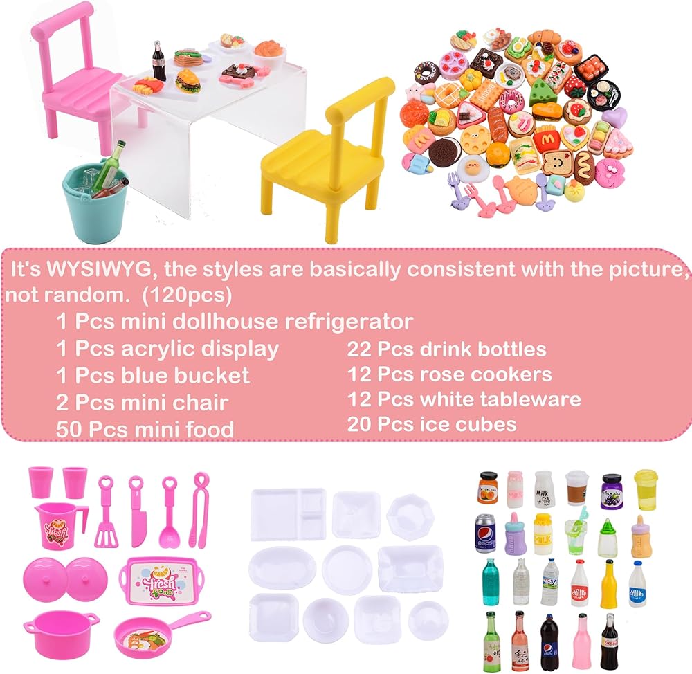 MUYIZI 120 قطعة ثلاجة صغيرة لبيت الدمى لعبة ثلاجة صغيرة مع زجاجات مشروبات طعام صغيرة ثلاجة صغيرة مع مكعبات ثلج أثاث المطبخ مجموعة طعام للأطفال ملحقات تزيين بيت الدمية المصغرة