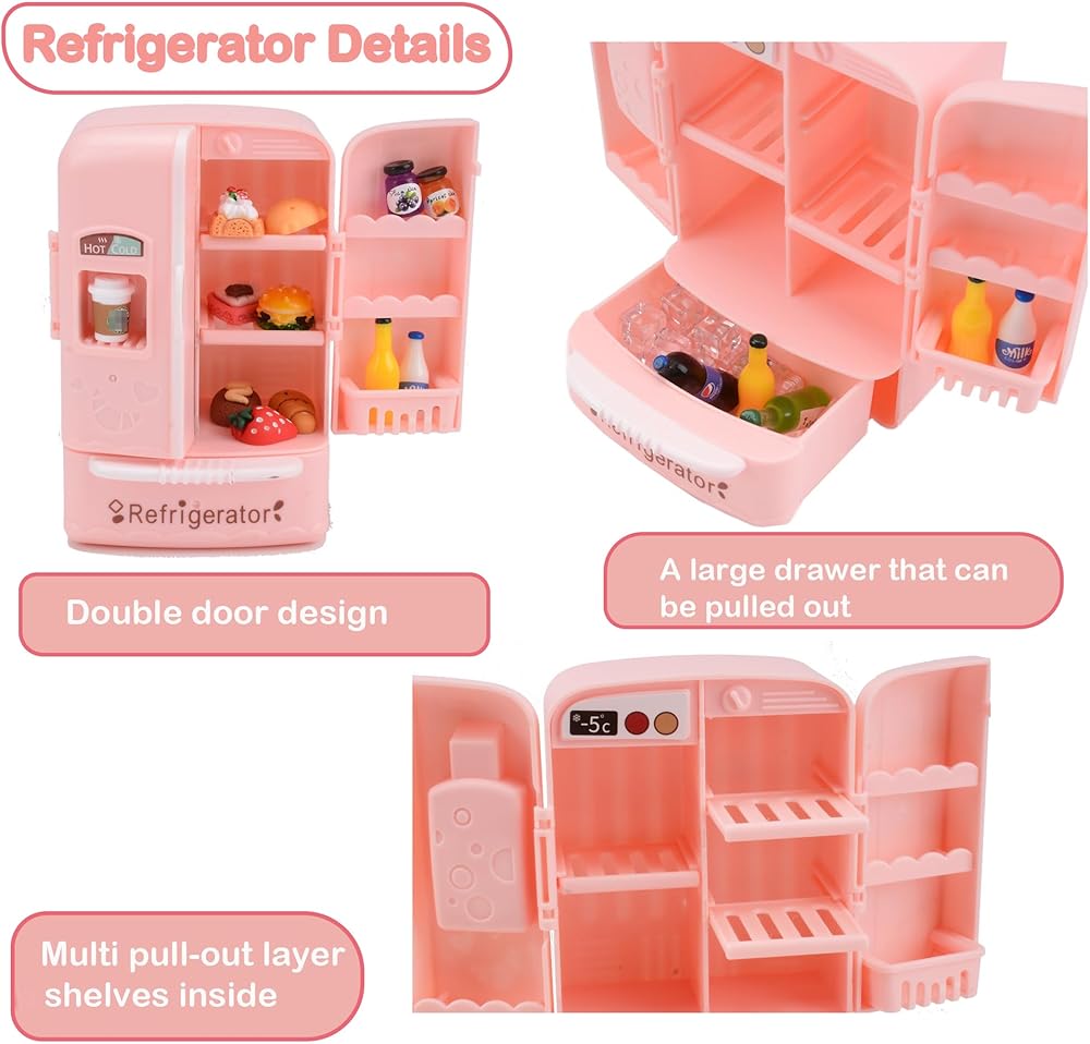 حجم مثالي لديكورات بيت الدمى: تبلغ أبعاد الثلاجة الصغيرة 2.95 × 2.36 × 4.72 بوصة، ومكعب الثلج 0.39 بوصة، ويبلغ قياس زجاجات الطعام والشراب الصغيرة حوالي 0.4 إلى 1.4 بوصة. تتميز ثلاجة بيت الدمى المصغرة بتصميم باب مزدوج وتحتوي على مساحات تخزين متعددة بما في ذلك أرفف متعددة الطبقات قابلة للسحب بالداخل ودرج كبير، وهي مثالية لحمل هذه المصغرات.