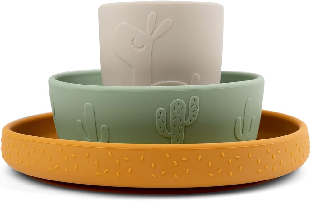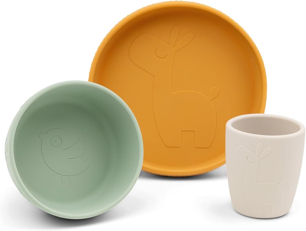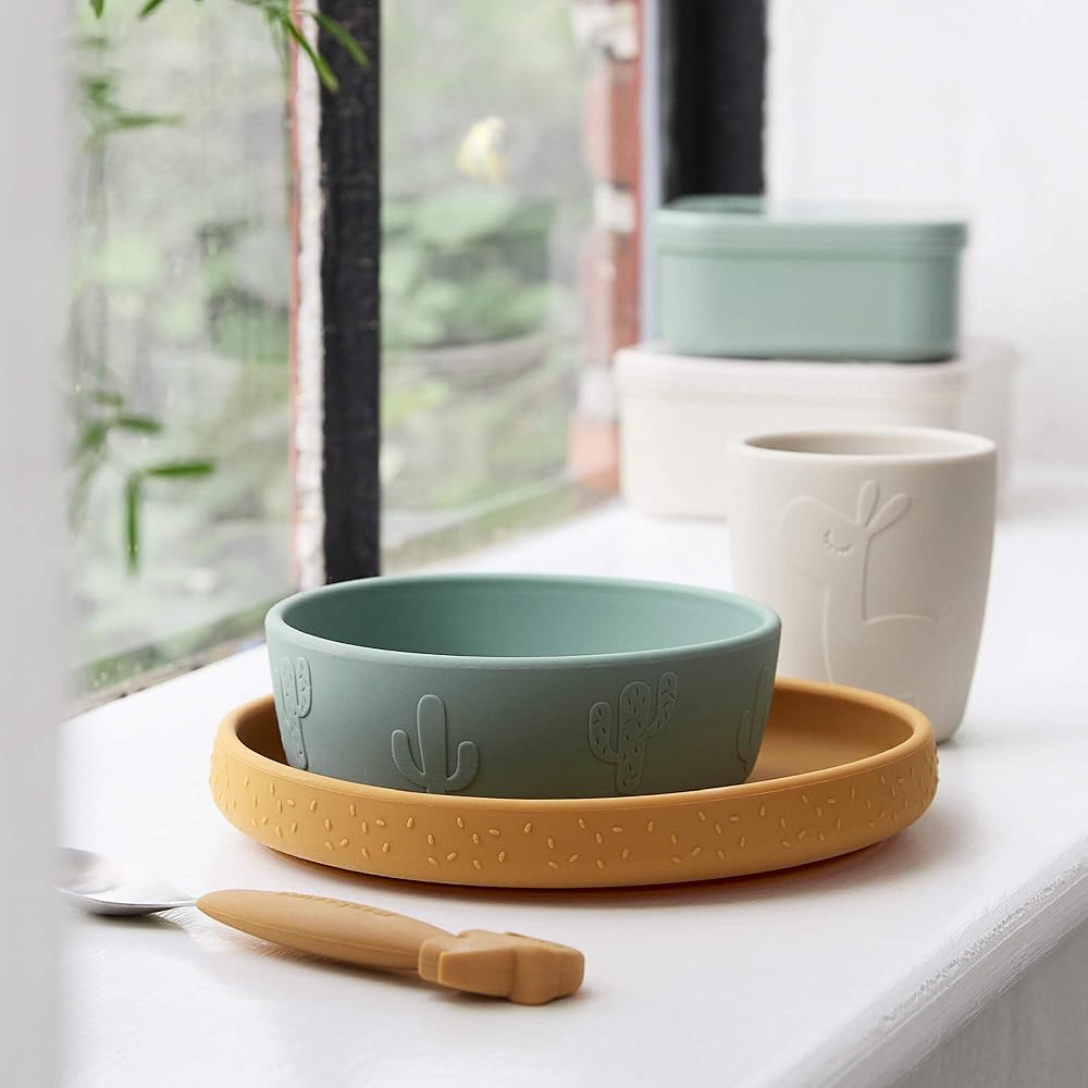 طقم عشاء Done by Deer Stick&Stay Lalee باللون الأخضر/الخردل/الرمل - 100% سيليكون من الدرجة الغذائية - تصميم مضاد للانزلاق وسهل الإمساك - مقاوم للغسل في غسالة الأطباق - مثالي لتجربة تناول الطعام الممتعة للأطفال
