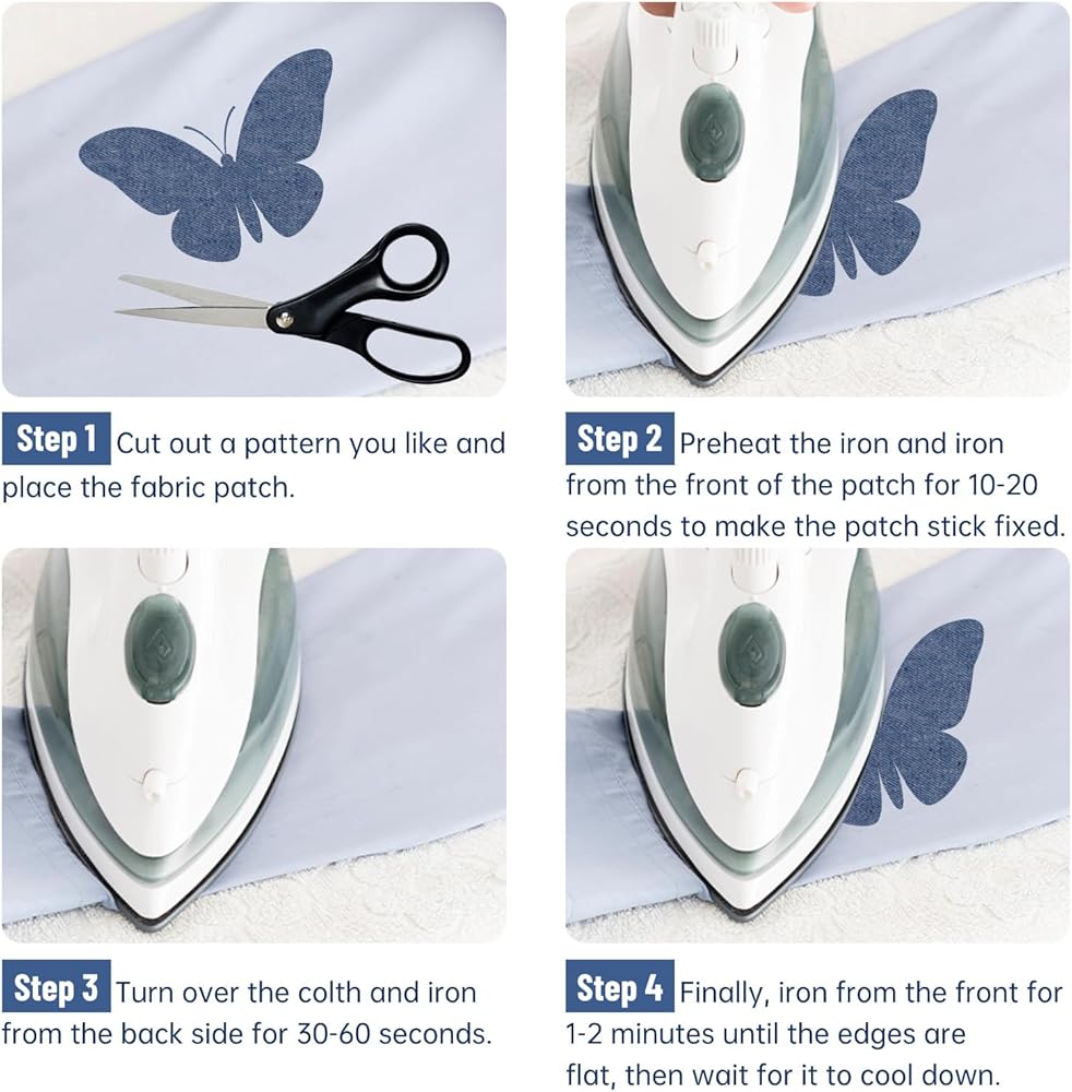 ✂️【سهلة الاستخدام】رقع الجينز مناسبة جدًا وسهلة الاستخدام، فأنت تحتاج فقط إلى المكواة. أولاً، قم بكي الملابس بشكل مسطح، ثم ضع الرقعة في الوضع المطلوب واضغط على المكواة على الرقعة لمدة 10-20 ثانية. يمكن كي كل رقعة حتى مرتين ويمكنك أيضًا تثبيتها بإبرة وخيط لجعلها أكثر أمانًا.
