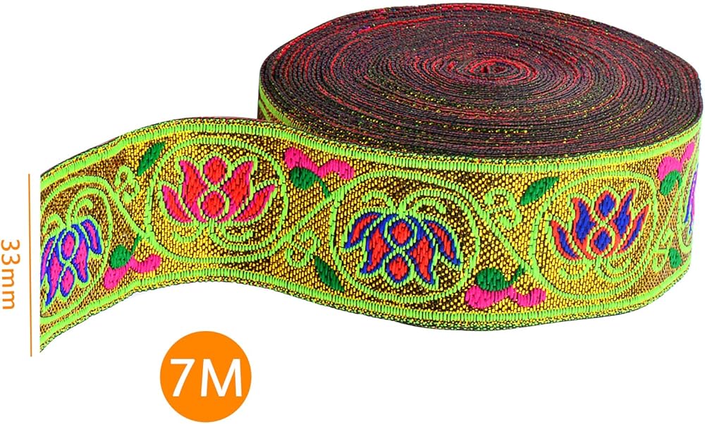 محتوى العبوة: هناك 1 لفة (7 أمتار) من أشرطة الجاكار الملونة مع نسيج مطرز بالزهور، تأتي بتصميم معدني ونمط زهرة اللوتس، وطول كافٍ ولون لامع يمكن أن يلبي احتياجاتك من أجل صناعة يدوية الصنع.