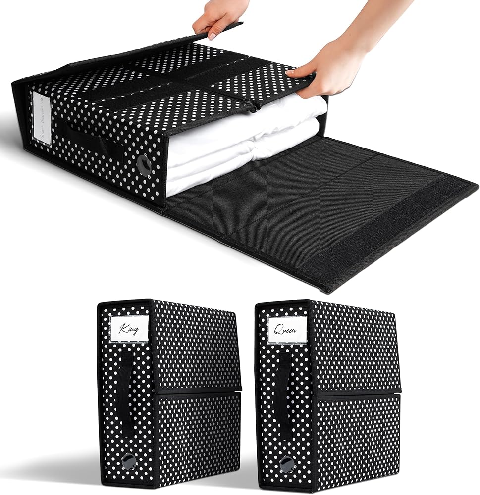 ملاءمة مثالية لأي مساحة: سواء كانت خزانتك أو أرفف عائمة أو تحت السرير، فإن الأبعاد المثالية لمنظم مجموعة الملاءات القابلة للطي لدينا والتي تبلغ 4.5 بوصة × 15 بوصة × 12.8 بوصة تضمن ملاءمة رائعة في معظم المساحات. قم بتخزين صندوق تخزين الأوراق، انقر فوق "أضف إلى العربة"!